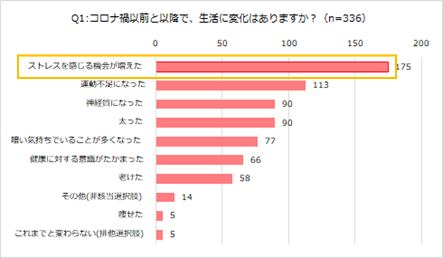コロナ禍での変化について「ストレスを感じる機会が増えた」という回答が最多