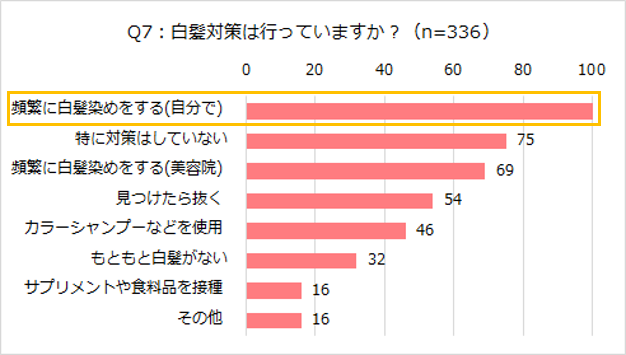 カラーシャンプーを使用してケアしているといった回答がある一方で、「特に対策をしていない」や「見つけたら抜く」など、白髪に対して充分にケアがされていない様子も明らかとなりました。