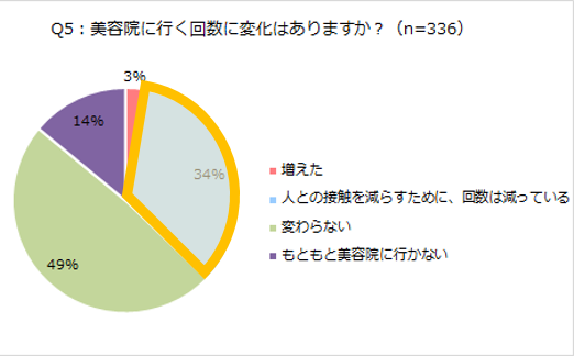 美容院に行く回数について聞いたところ、半数の方は以前と変わらないと答えたものの、3割超の方が「人との接触を減らすため、回数は減っている」と回答しました。