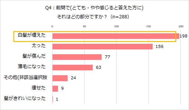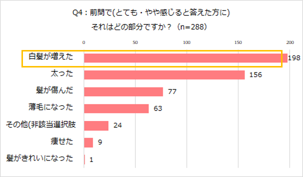 さらに、「とても感じる」「やや感じる」と答えた方に「どの部位に対して感じるか」を尋ねたところ、「白髪が増えた」という回答が多く、回答者の約7割近くとなりました。次いで、「太った」、「髪が傷んだ」、「薄毛になった」という回答が続き、身体の変化の中でも頭髪に関する悩みを感じる人が増えていることが明らかになりました。