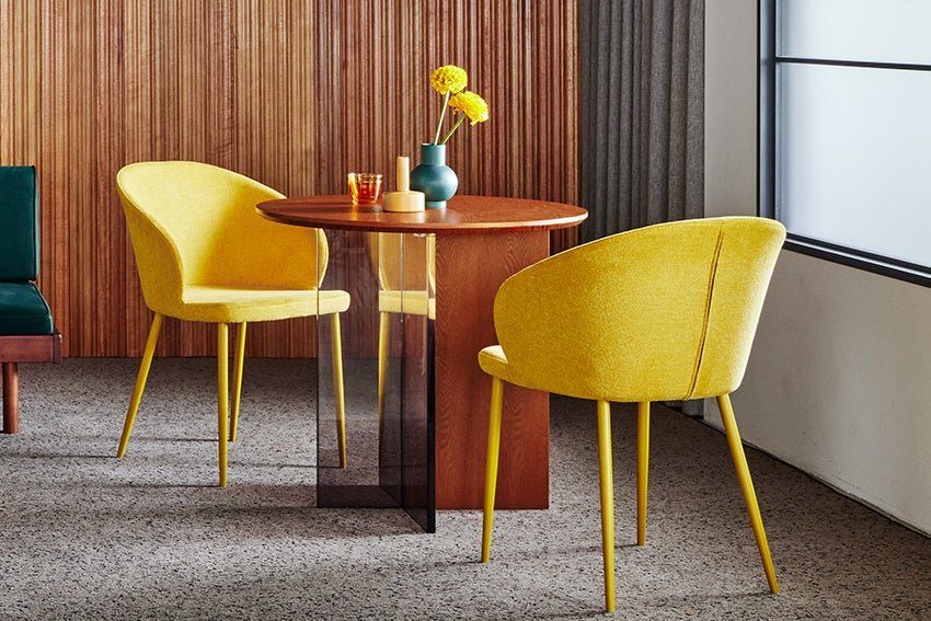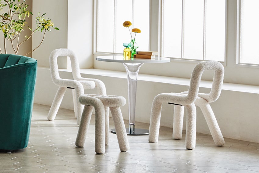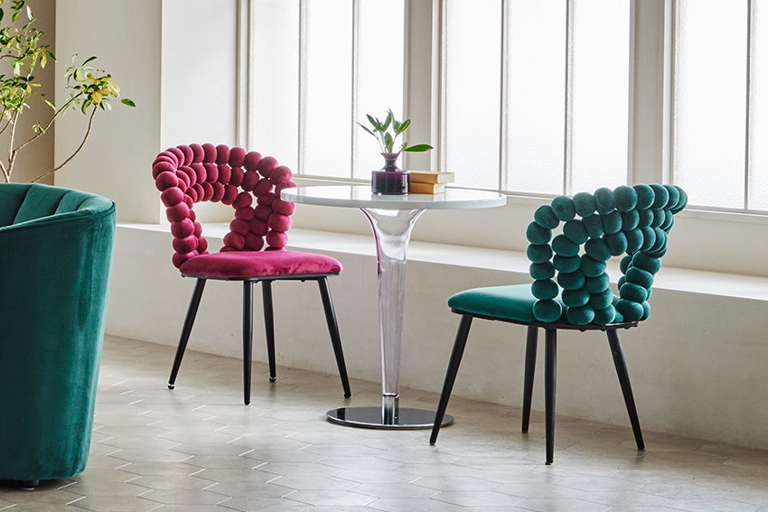 クロスしたアクリルと天然木の脚が織りなす、新感覚のダイニングテーブル