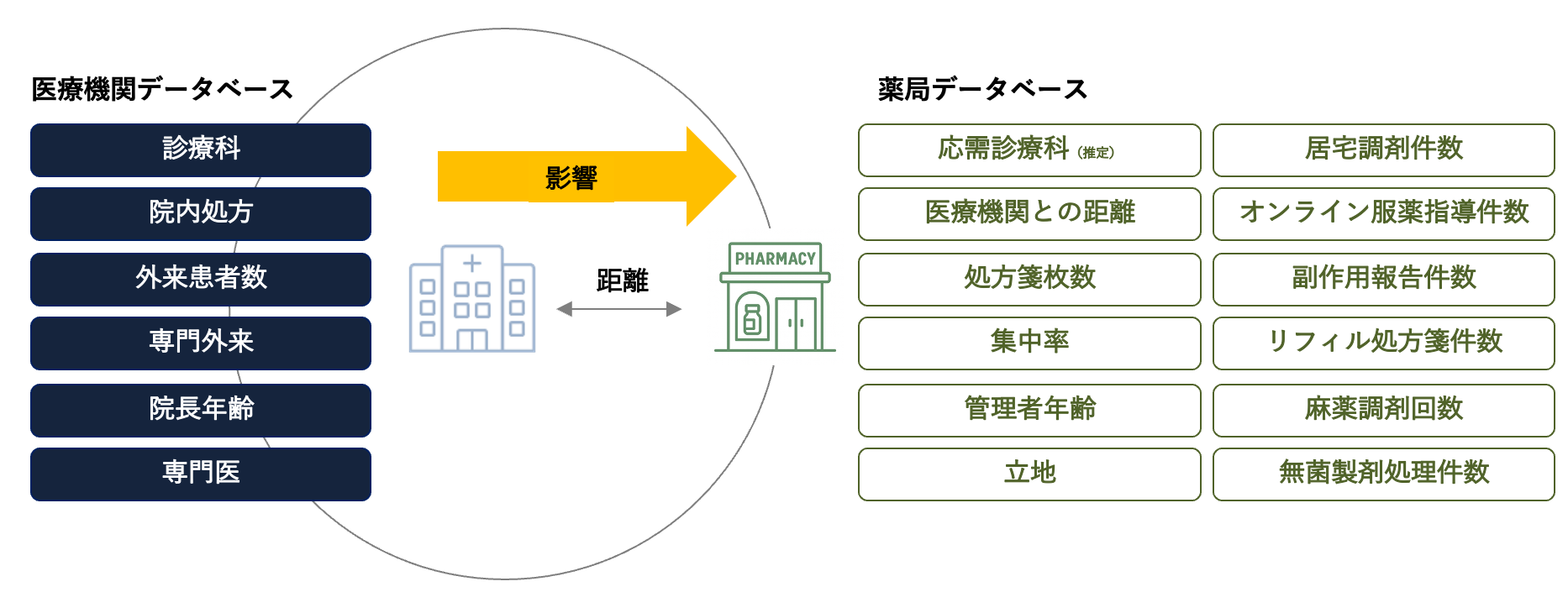 これにより、 医療モールや門前薬局の多いチェーンや減算インパクトが大きい法人、周辺薬局密集度が高い地域といった薬局法人・店舗でのターゲティングが可能になります。