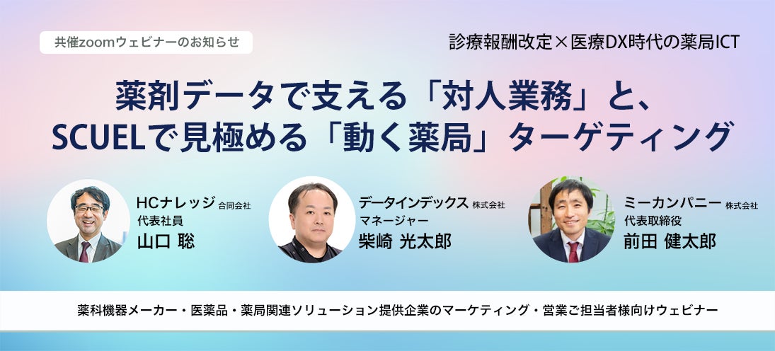 ミーカンパニー株式会社(本社:東京都港区、代表取締役:前田 健太郎)は、2026年度調剤報酬改定への対応を支援するため、医療・薬局データベース「SCUEL(スクエル)」の薬局戦略データセットを刷新し、新たに「薬局グループ情報」「立地情報」を追加したことをお知らせいたします。