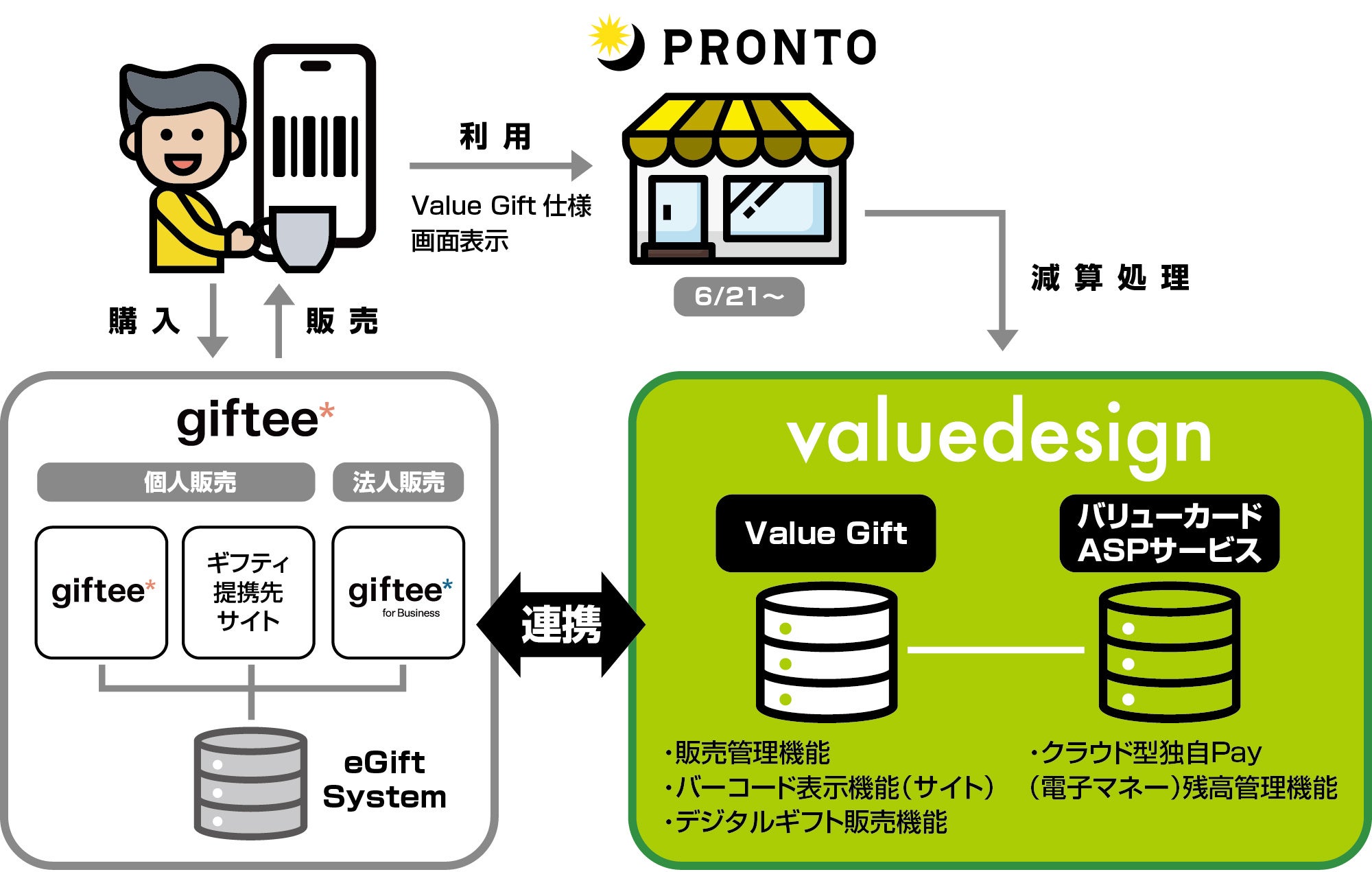 本連携の第一弾として、株式会社プロントコーポレーションが運営する全国のプロントで利用可能な「プロントマネーデジタルギフト」をギフティが運営するeギフト販売サービス「giftee」にて販売開始いたします。プロントでは、既にバリューデザインが提供する独自Payサービスを運用しており、高まるギフト需要を背景に、ギフトによる新規顧客の獲得を目的として、「プロントマネーデジタルギフト」を導入いただきました。