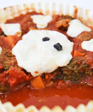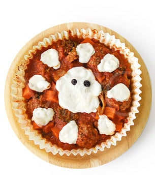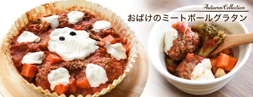 ごろっとしたミートボールと野菜のグラタン。ベースにはトマトを使用して、塩分を控えたモッツァレラチーズでおばけを型取りました。
