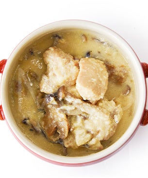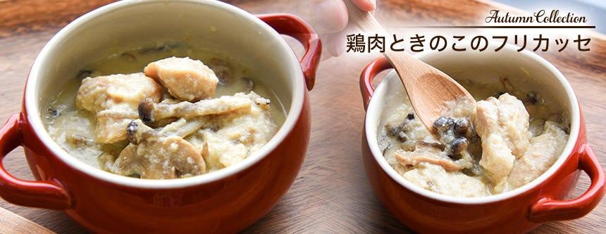 フランスの家庭料理「フリカッセ」を犬用にアレンジ。秋の味覚、きのこをたっぷり3種類と豆乳を使ったコクのあるソースを鶏肉と煮込みました。秋の訪れを感じる一品です。
