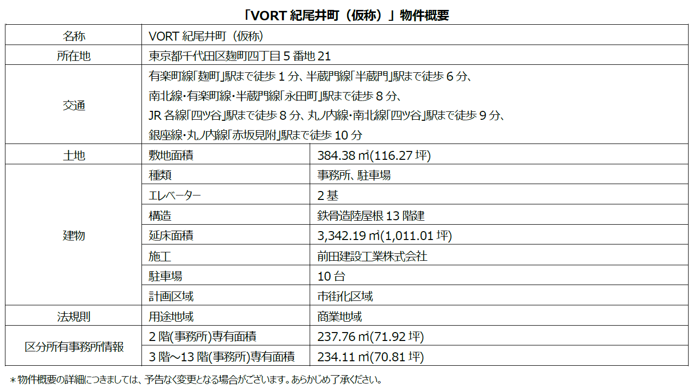 販売用不動産取得のお知らせ『VORT紀尾井町(仮称)』を取得~ビジネスエリアとして発展する麹町 新宿通り沿いにそびえるオフィスビル~