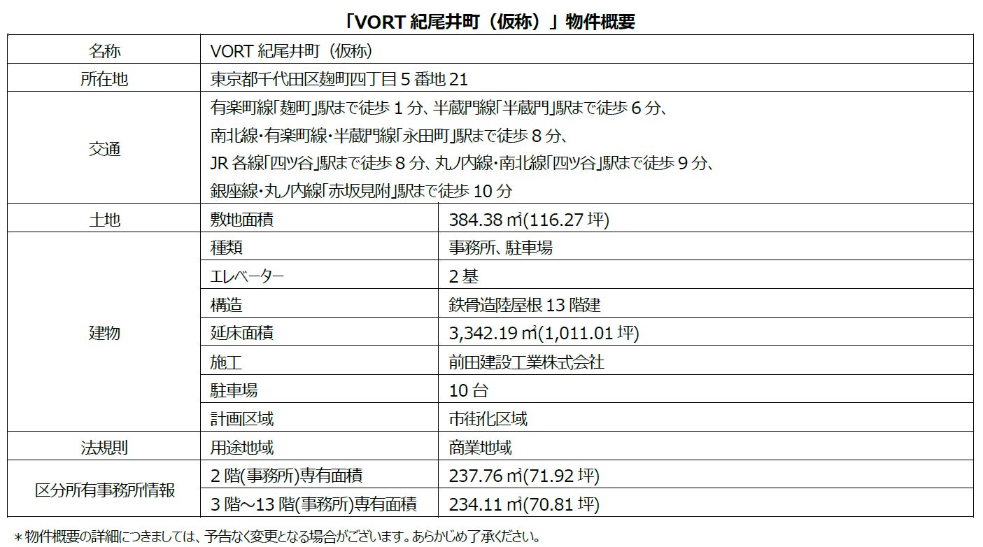 「区分所有オフィス®」を主軸に資産形成コンサルティングを行う株式会社ボルテックス(東京都千代田区 代表取締役社長 兼 CEO 宮沢 文彦、以下当社)は、「VORT紀尾井町(仮称)」を取得しましたのでお知らせいたします。