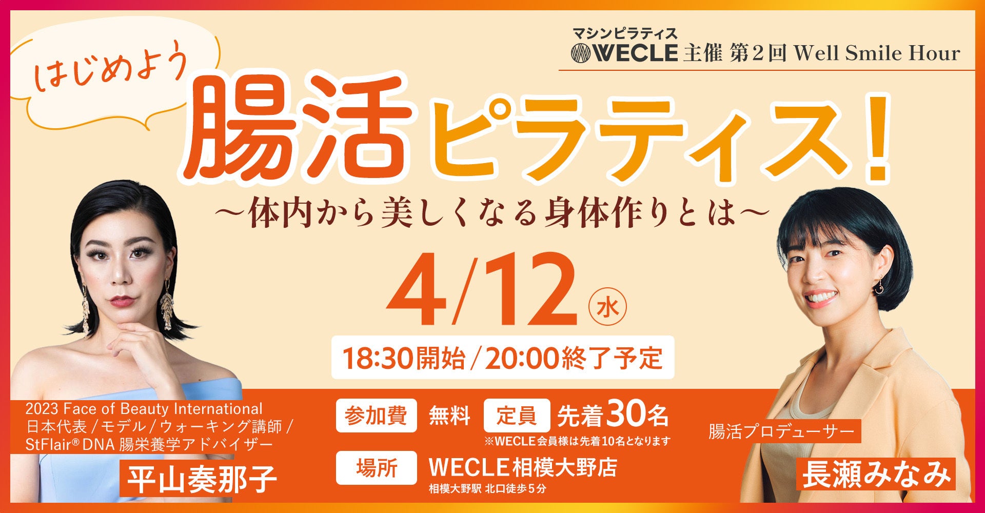 マシンピラティス「WECLE(ウィークル)」(株式会社nobitel、本社:東京都新宿区、代表取締役:黒川 将大)は、“体内から美しくなる身体作りの秘訣”をテーマしたトークイベント「第2回 Well Smile Hour」を4月12日(水)にWECLE相模大野店で開催することをお知らせします。