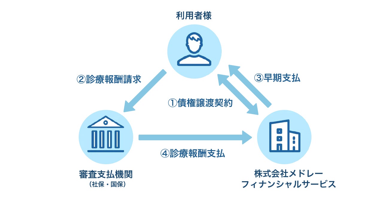 「メドレー早期資金サポート」は、通常2ヶ月程度かかる診療報酬や介護報酬の受け取りを申し込みから最短3日で資金化することができる、早期の資金調達を実現するファクタリングサービスです。来店の必要がなくメールや郵送での申し込みが可能なため、全国の医療機関、介護施設、障がい福祉施設にご利用いただいています。