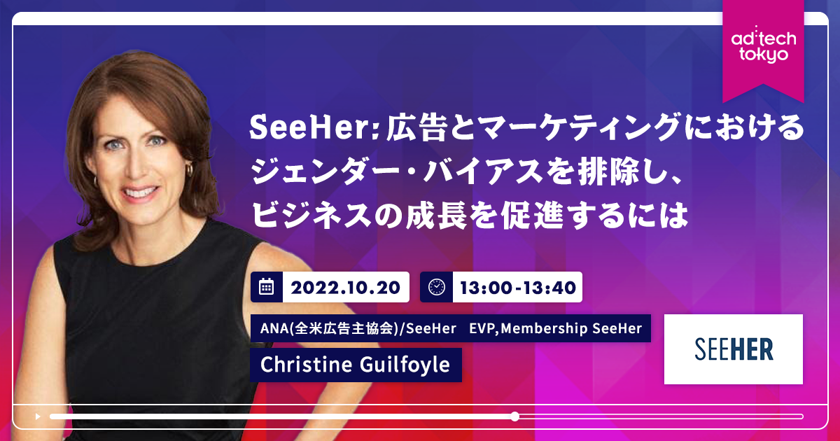 SeeHerは、マーケティング、広告、メディア、エンターテインメントにおける女性や少女の正確な描写を増やし、彼女たちがありのままの自分、そしてすべての可能性を見い出すことができるようにするというミッションのもと、マーケター、メディアリーダー、広告会社、業界インフルエンサーが結束している国際的なメンバーシップコミュニティです。全米広告主協会(ANA)が主導し、The Female Quotient(FQ)と連携して、SeeHerは広告とメディアにおける男女平等のための業界の主要な組織となりました。取り組みの成功を計測するため、2016年にSeeHerは、広告や番組におけるジェンダーバイアスを定量化する初の調査手法であるGender Equality Measure (GEM®)を開発しました。GEM®は、世界の広告費の87%を占める20万件以上の広告を測定し、今では世界的な測定基準となっています。SeeHerの取り組み、ソートリーダーシップ、トレーニング、そしてGEM®をビジネスの流れに組み込む方法について解説します。広告とメディアにおけるジェンダー平等と交差性は必須であり、それは、ビジネスにとっても、社会にとっても良い取り組みとなるのです。