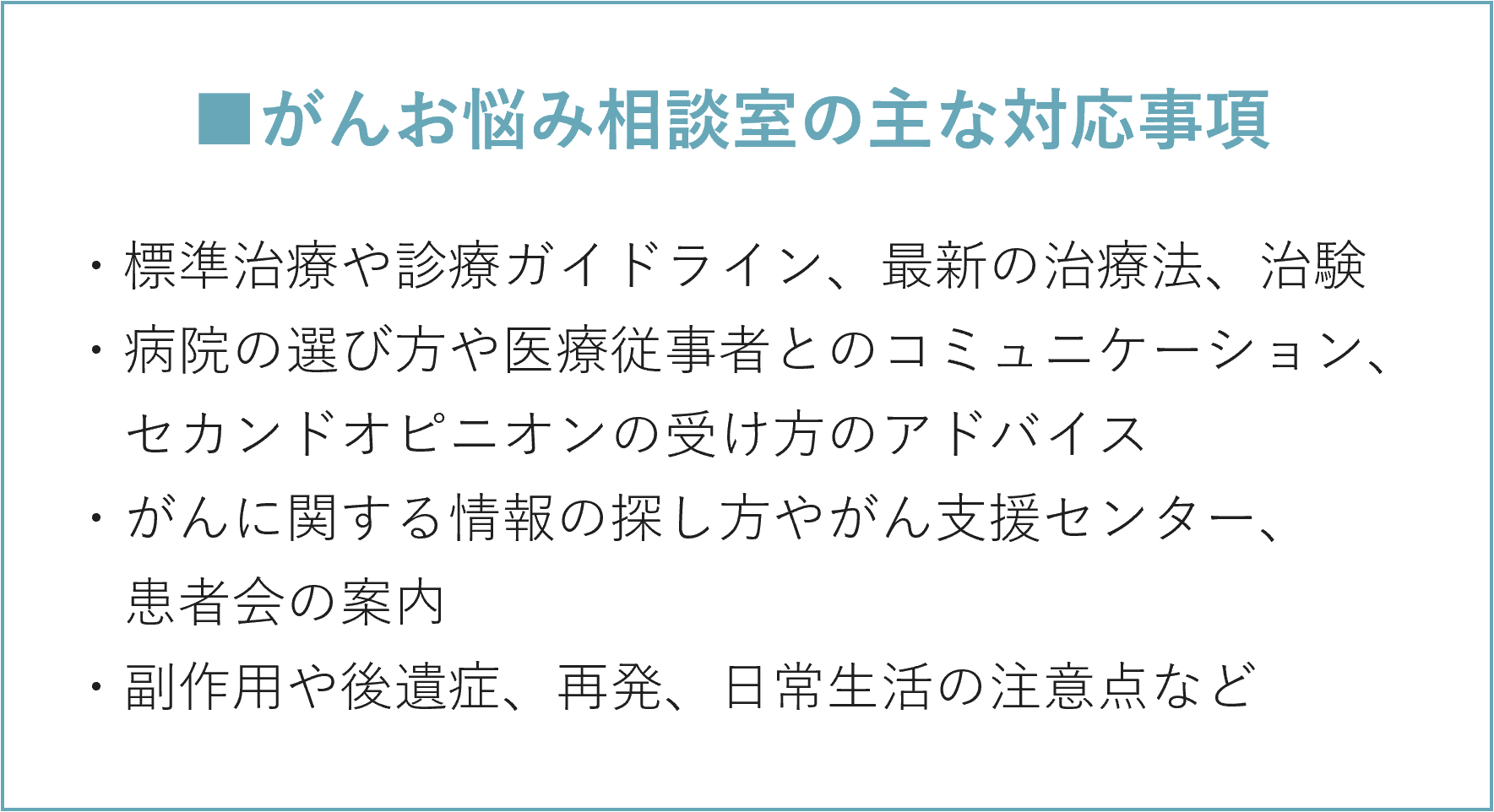 そこで、こうしたがん患者の課題解決に貢献すべく、すでに行っていたがん治験相談の対応範囲を治験以外にも広げた、がんお悩み相談室をオンコロで開始しました。また相談室以外にもそれぞれの患者に合わせた継続的な情報提供なども開始いたします。