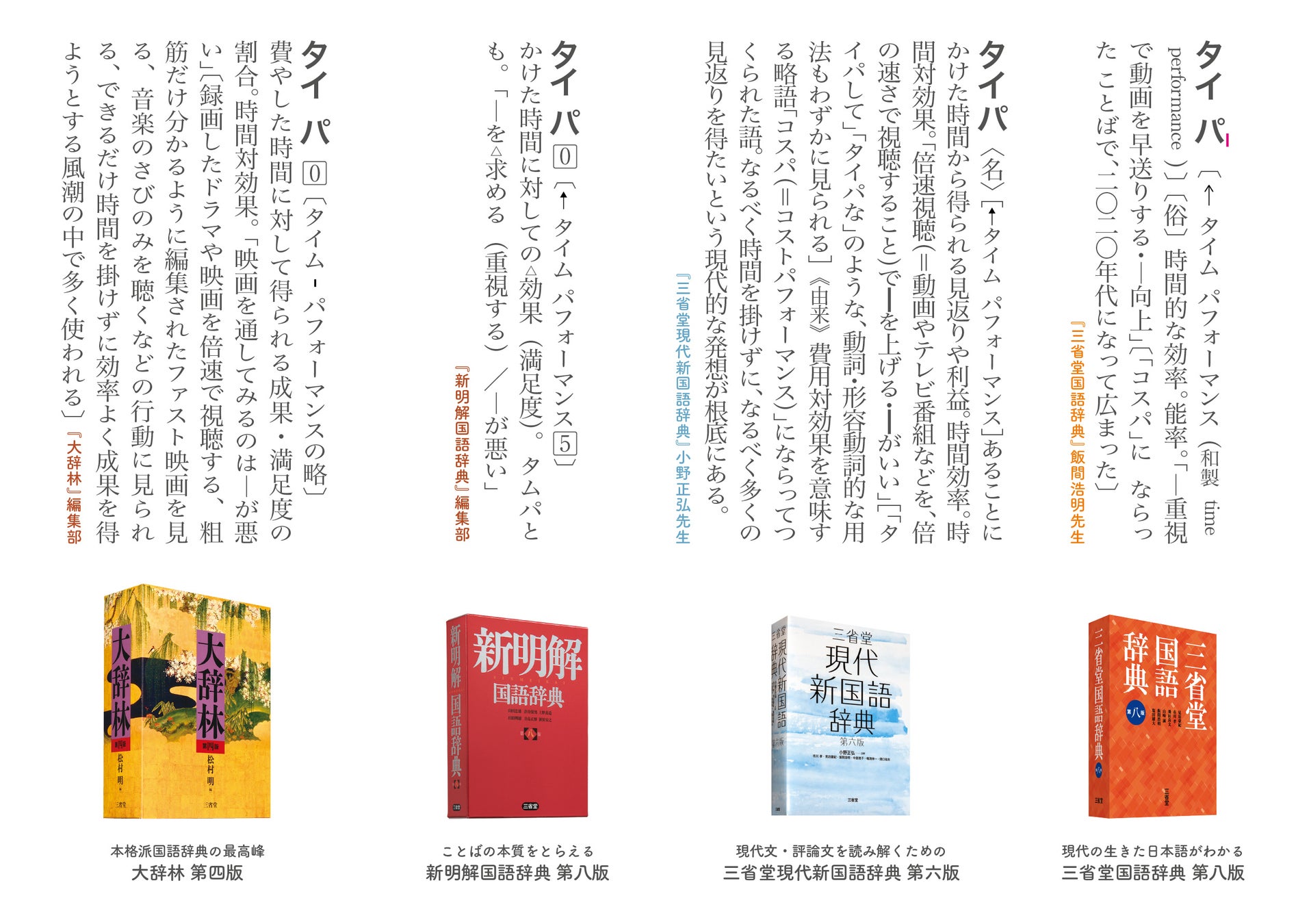 タイ パ 〔←タイムパフォーマンス(和製time performance)〕〔俗〕時間的な効率。能率。「―重視で動画を早送りする・―向上」〔「コスパ」にならったことばで、二〇二〇年代になって広まった〕