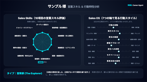 ミスマッチの根源を解消するため、求職者の現在地と企業の求める要件を「Sales Profile(条件)」「Sales Skills(10項目の実務スキル)」「Sales OS(7項目の志向性・カルチャー)」の3階層で分析します。そのうえで、10項目の「Sales Skills」と7項目の「Sales OS」、さらに分析結果から導き出される「16タイプの適性診断」を独自の『セールスバイタルシート™』として可視化します。自身のスキルと適性が数字と言葉で手元に残り、面接でも転職後も活きる確かな“資産”となります。