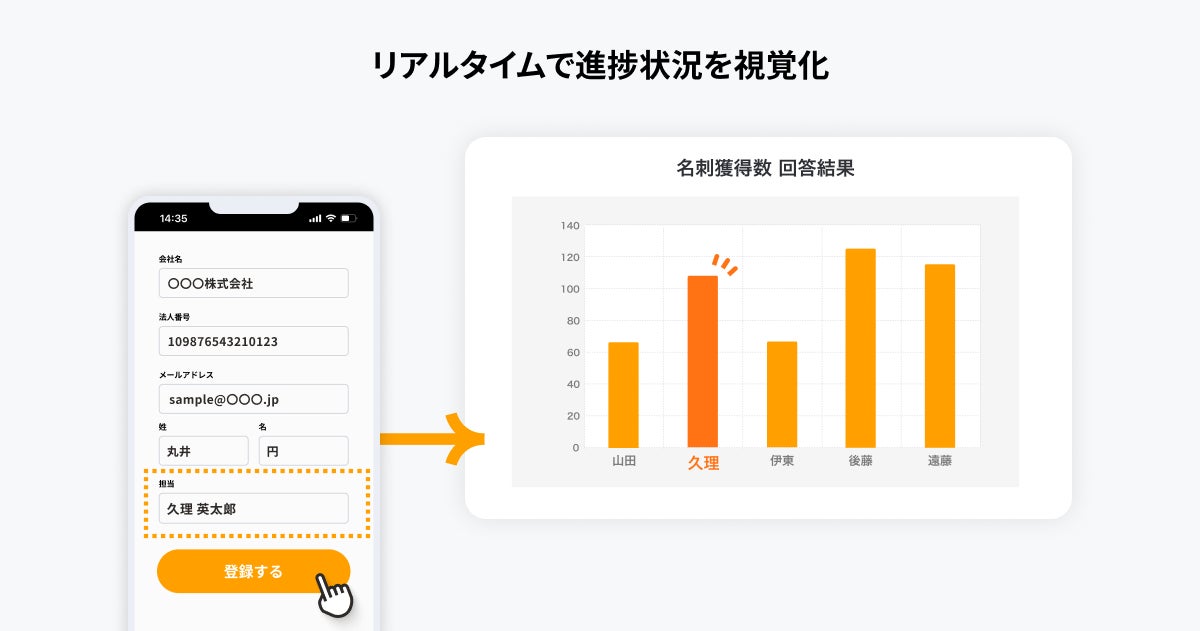 展示会の進捗状況をリアルタイムに可視化: Ask Oneの名刺即時データ化機能によって来場者の名刺を読み取ったり、接点を持った来場者の情報をAsk Oneで作成したフォームに入力したりすると、現在の施策状況の速報値がグラフで可視化されます。これにより、進捗をリアルタイムで視覚的に確認でき、迅速な意思決定や即時的なアクションの実行をサポートします。