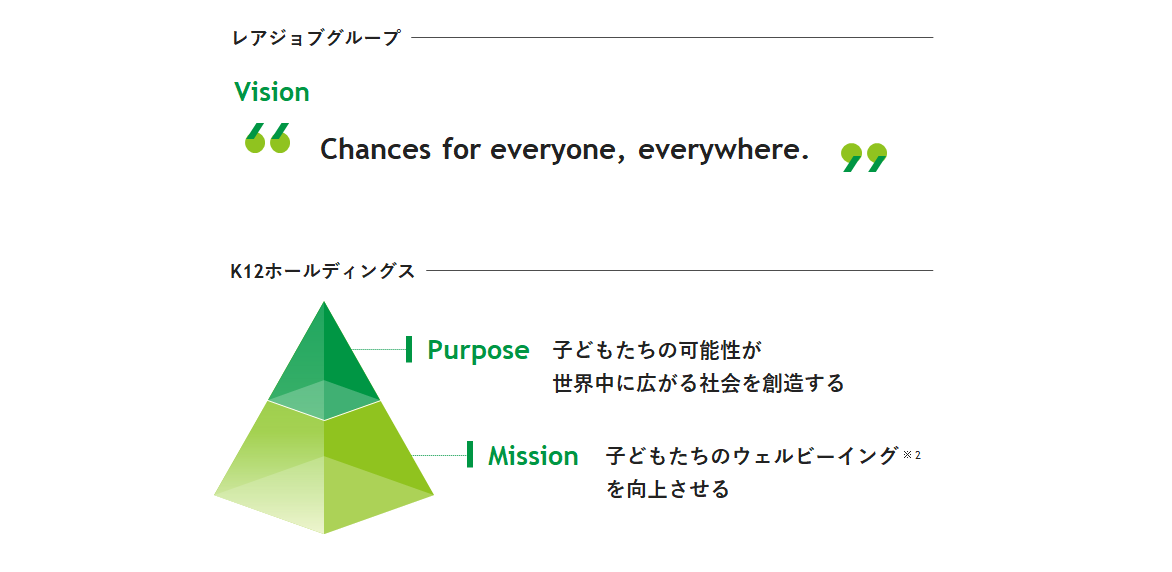 レアジョブグループでは、グループビジョンである“Chances for everyone, everywhere.”の実現を目指しております。ビジョンの実現に向け、多角的な事業を有するレアジョブグループの中でも、K12HDは「子ども子育て支援事業」を展開してまいります。