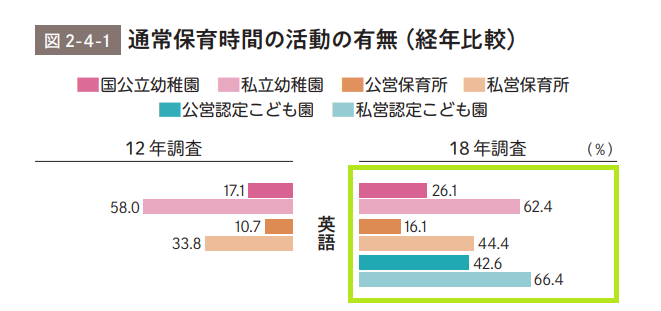 英語は、2020年度の「新学習指導要領」の全面実施によって外国語活動(英語)の授業が小学3年生からに引き下げられるなど、より幼少の段階から学習を始める動きが加速しております。さらに、保育活動の中で英語を取り入れている保育園・幼稚園も増加傾向にあります。