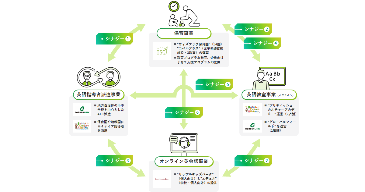 事業会社の4社は、「英語指導者派遣」「保育」「オンライン英会話」「オフライン英語教室」という4つの事業領域でサービス提供を行います。