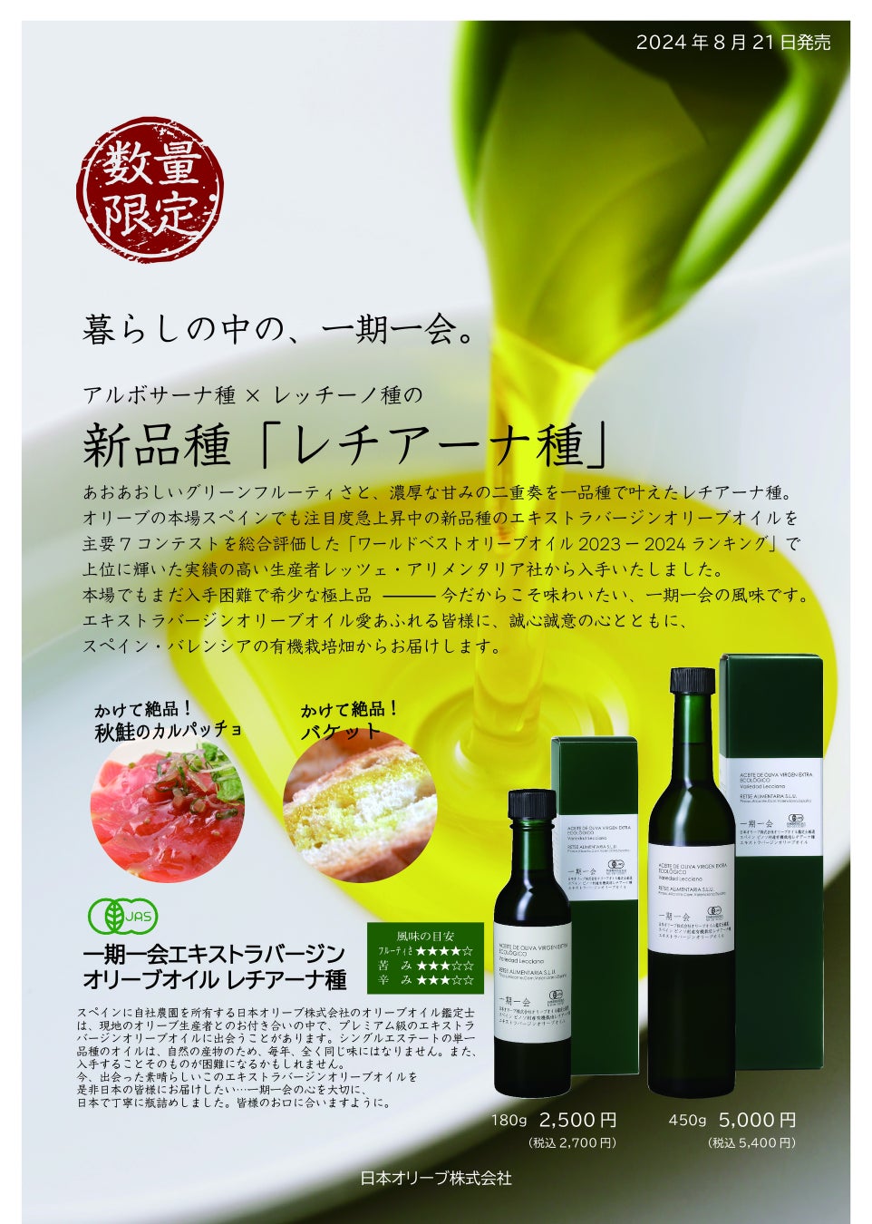 ⽇本オリーブ株式会社(所在地:岡⼭県瀬⼾内市⽜窓町、取締役社⻑:服部芳郎)は、スペイン バレンシア地方産レチアーナ種(有機栽培)を100%使⽤したシングルエステート単⼀品種のオイル「⼀期⼀会エキストラバージンオリーブオイル レチアーナ種」を2024年8⽉21⽇(⽉)にオンラインショップ等で数量限定発売いたします。