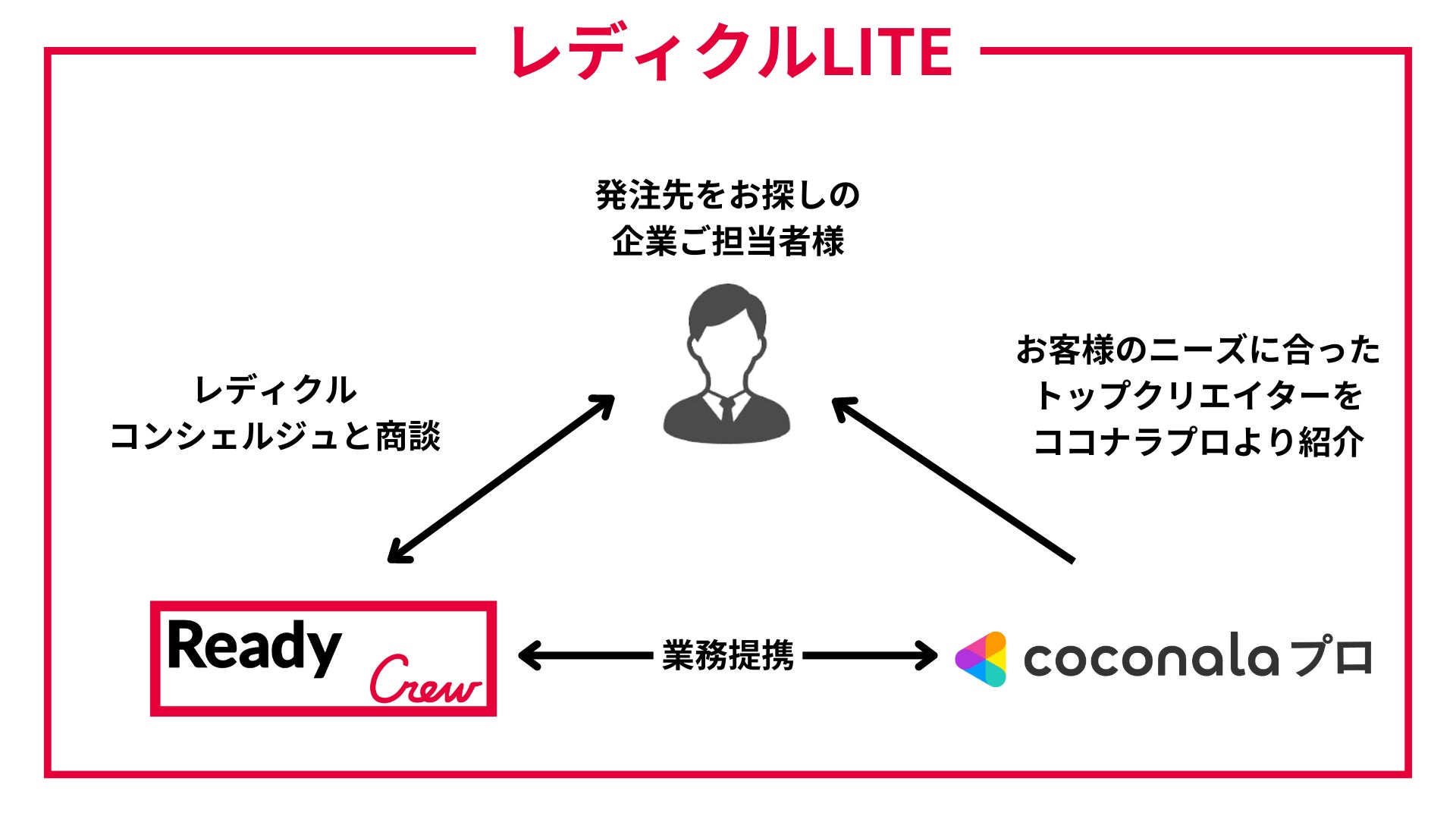 従来は、レディクルのコンシェルジュが弊社ネットワークの中からマッチする法人企業をご紹介してきましたが、新サービス「レディクルLITE」では、レディクルでの提供が難しいビジネスマッチングニーズにおいて、ココナラプロを介してトップクリエイターを紹介します。
