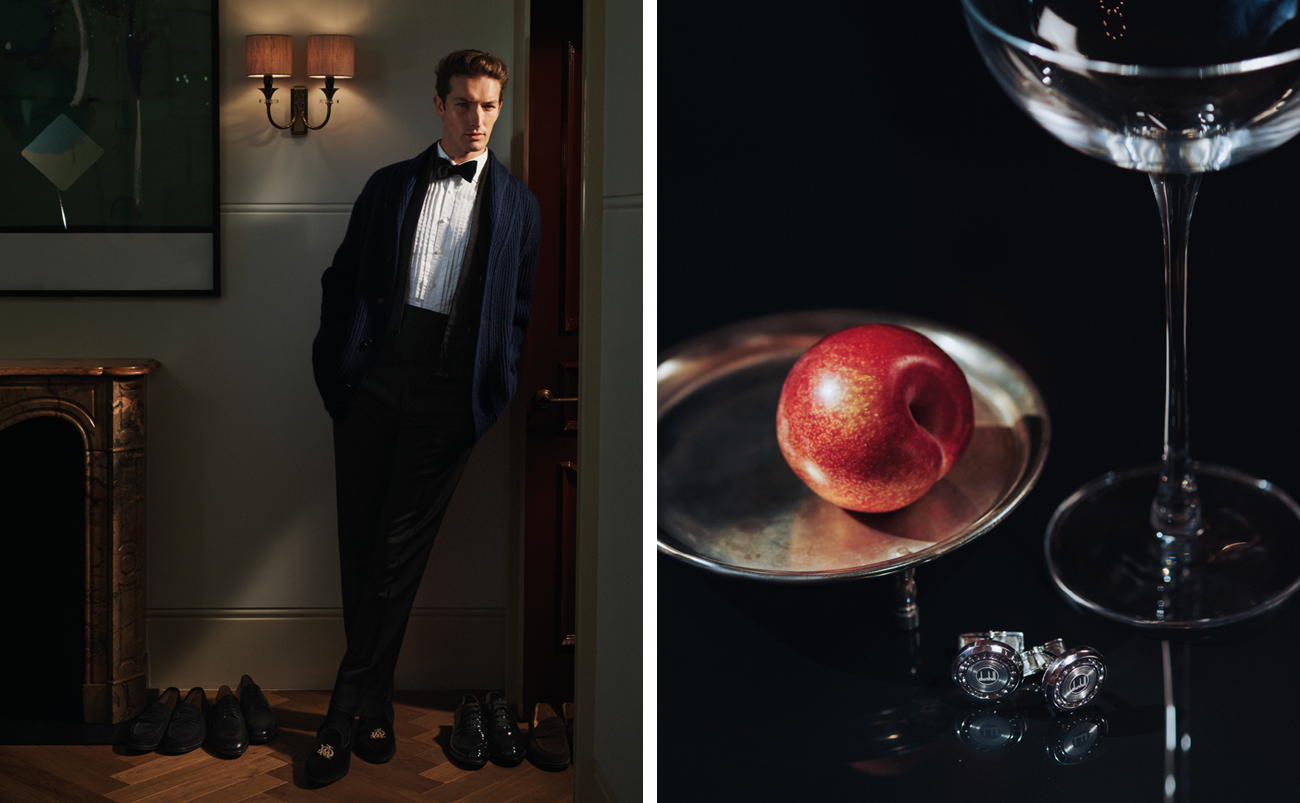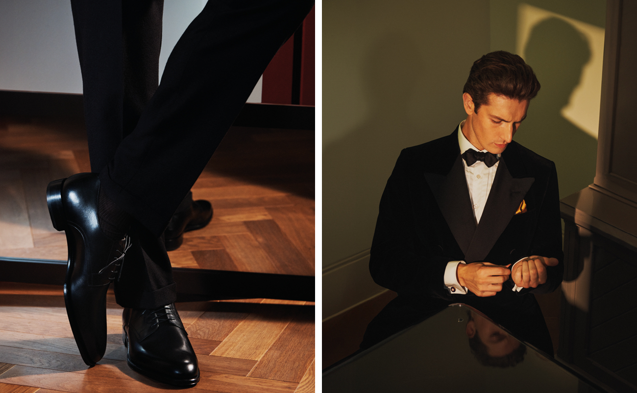 ダンヒルの上質なパーティシーズンの装いには、厳選された美しいフォーマルウェアが含まれます。ハウスのソサエティシルエットで仕立てられたウール バラシア イブニングジャケットには、相性の良いパンツと複雑にプリーツ加工されたイブニングシャツを組み合わせ、スタイルのある装いでフェスティブシーズンを祝います。