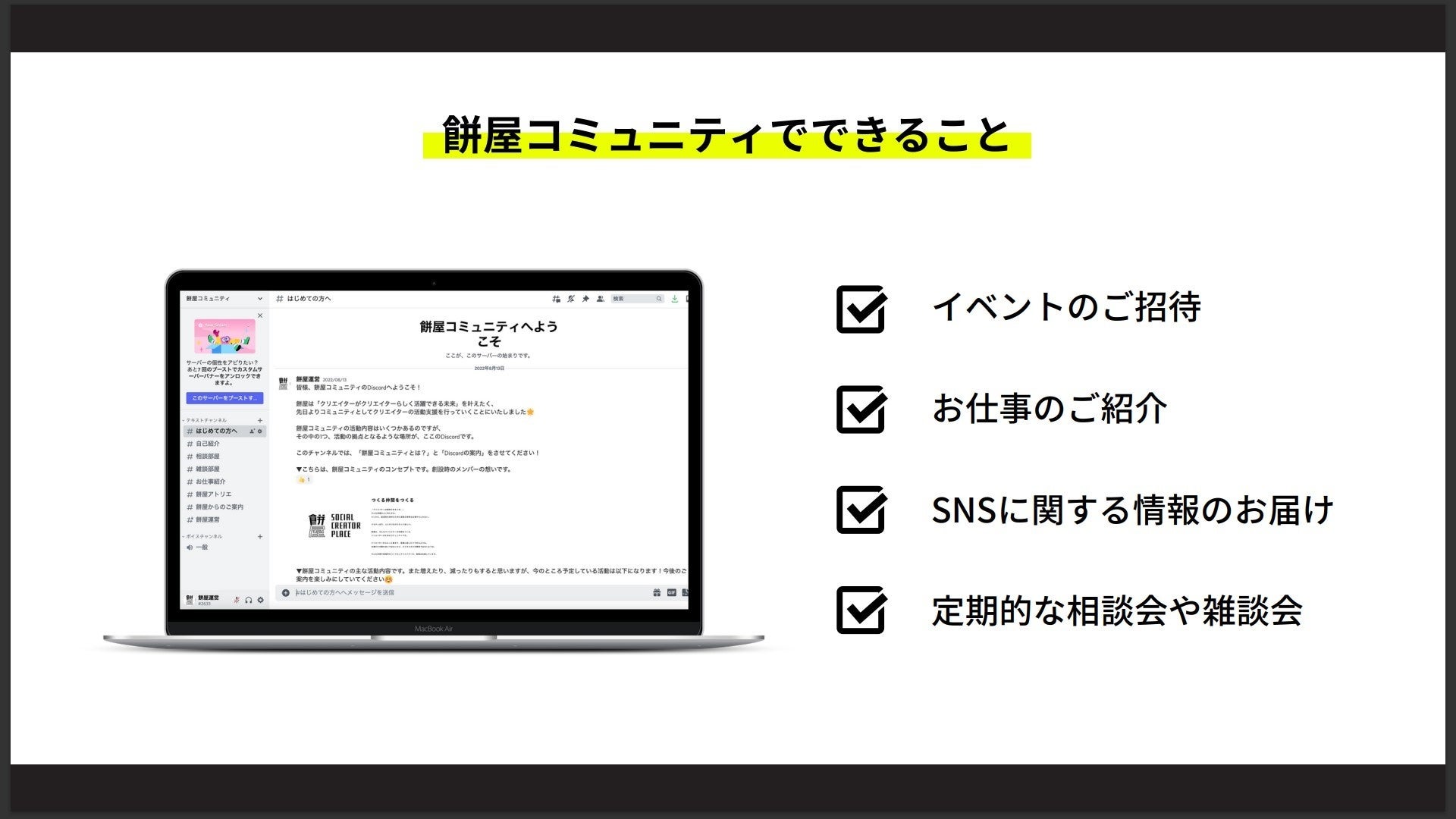 タカミは「新しくなった餅屋では、まず、クリエイター同士が気軽に交流できるDiscord上でコミュニティを作りました。ここではミートアップイベントのお知らせや案件の紹介など、餅屋が提供するサービスの連絡やクリエイター同士の交流の場として活用しています。今後も、今回のようなオフラインでのミートアップイベントや、遠方の方でも気軽に参加できるオンラインのミートアップイベントや勉強会を企画しています。」と今後の展望を語りました。