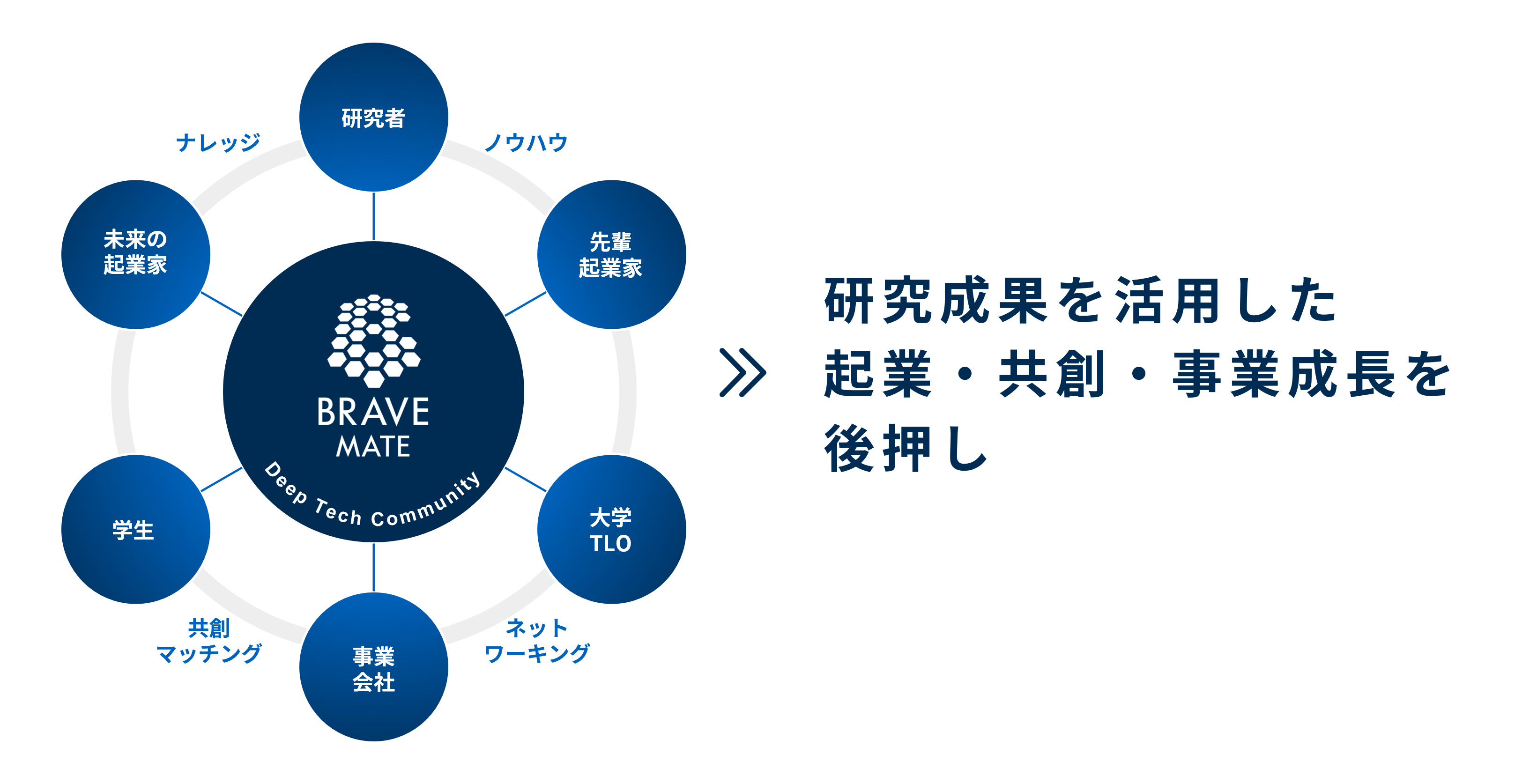 BRAVE MATEは、研究シーズを持つ120チームに対して事業化支援を行ってきたBRAVEが有する知見・ネットワークを活用し、社会的インパクトの大きな事業を生み出すことを目指す研究者をはじめ、科学技術の社会実装やビジネス展開に興味のある方々の繋がりを促進することで、ディープテック領域でのビジネスを加速することを目的としています。