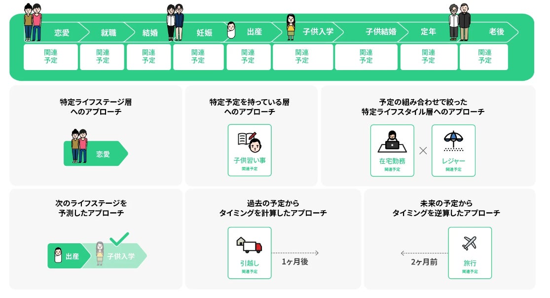 TimeTree Adsの「未来行動ターゲティング」は、TimeTreeに登録された未来の予定データを活用した独自のターゲティングが可能な広告メニューです。ユーザーが登録した「旅行」「イベント参加」「購買予定」などの未来の行動に関連する予定情報に基づき、関連性の高い商品やサービスの広告を配信することで、ユーザーの関心が高まるタイミングでの効果的なアプローチを可能にします。