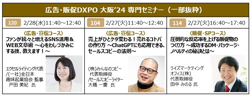 広告・宣伝コースでは、ライター歴20年の文章のプロ、エクセルライティング 代表 戸田美紀氏が、WEB上でファンが続々と増えるSNS活用や文章術を徹底解説、また販促・SPコースでは、郵政省での商品企画や店舗集客の実績を持つ、ライズマーケティングオフィス(株) 代表取締役 田中みのる氏が、反応率を上げる販促物づくりの秘訣を紹介するなど、売上・集客アップを目指す広告・宣伝・販促のプロ必聴のセミナーが多数開催される。
