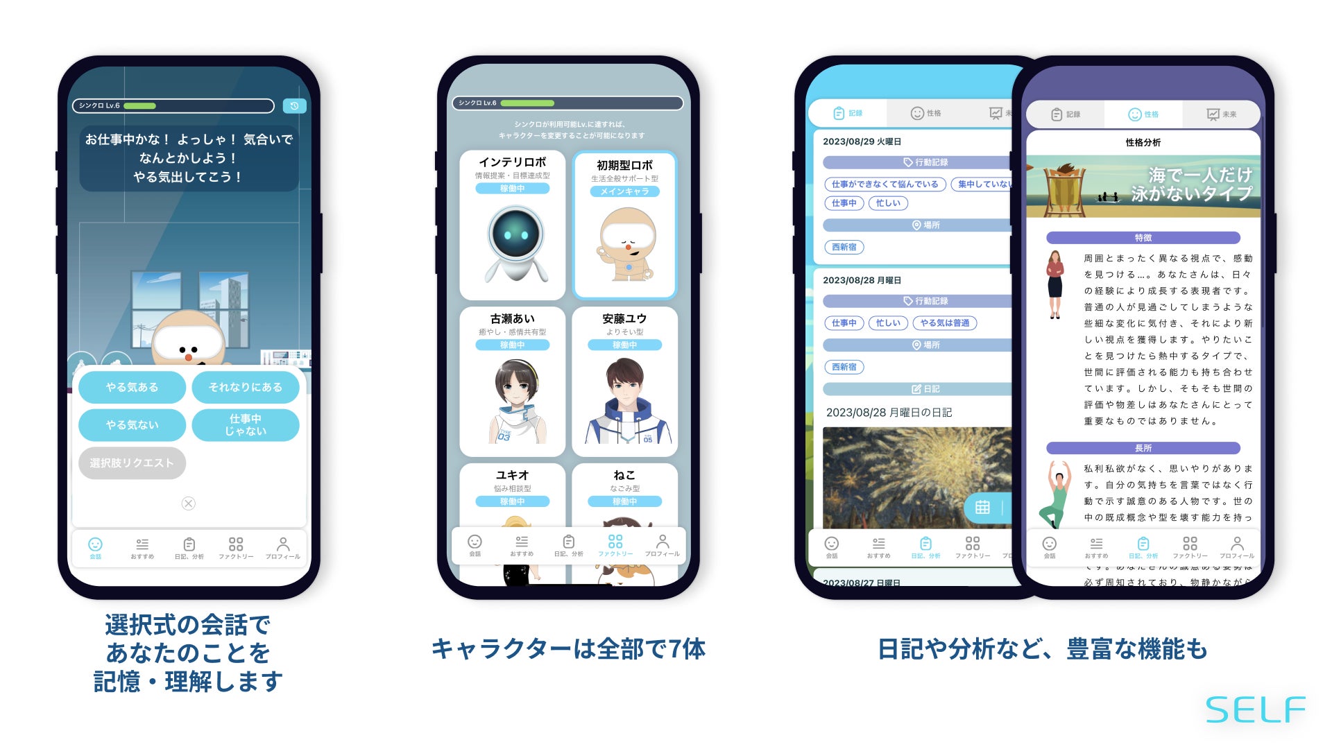 SELFアプリは、個性豊かなAIキャラクター達(以下、AIキャラクター)とユーザーが日常的に会話をすることで、ユーザーを理解し、生活サポートやメンタルケアを行うスマートフォンアプリです。