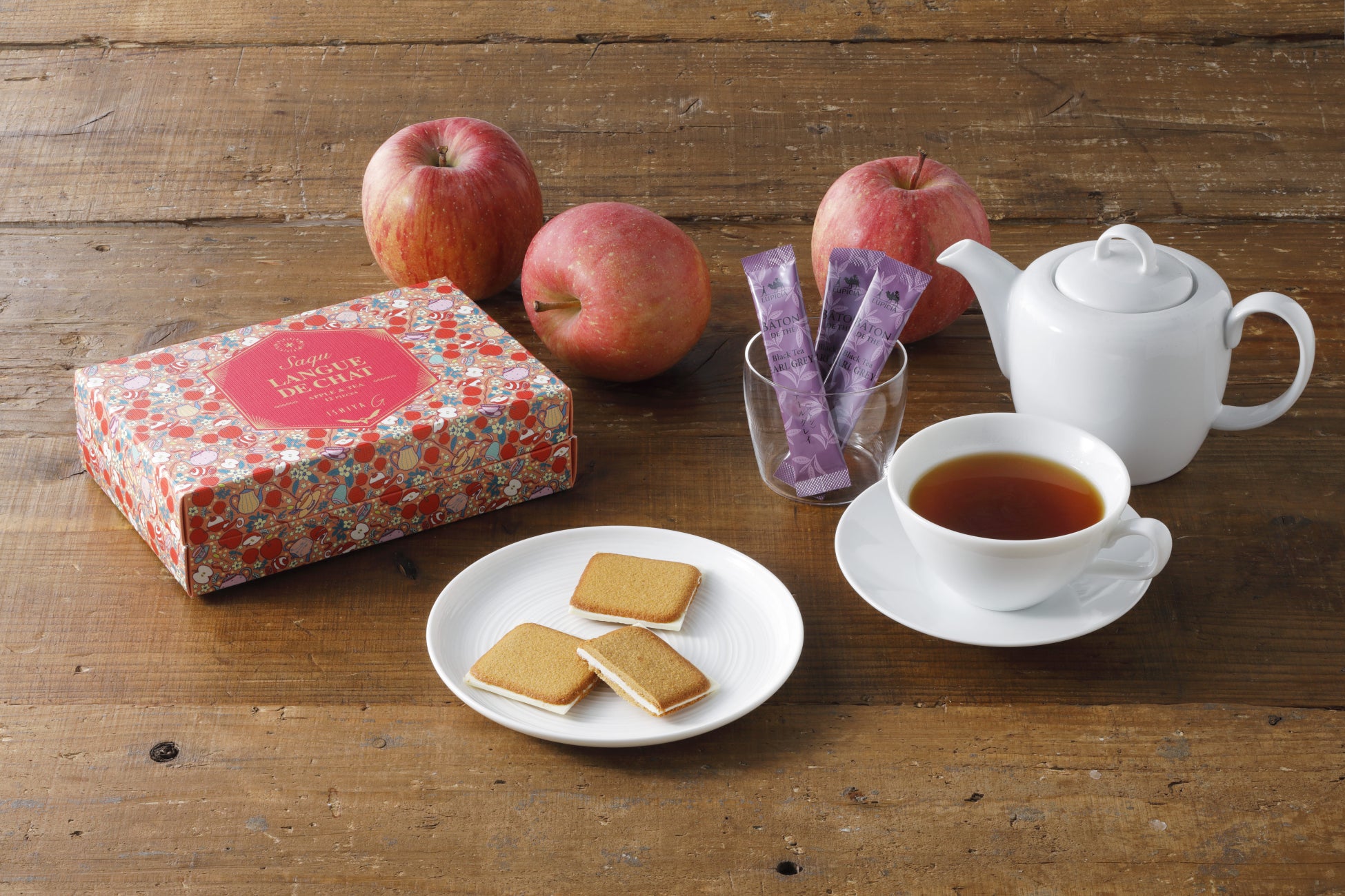 今回の期間限定ショップでは、白い恋人から生まれた彩りラング・ド・シャ「サク ラング・ド・シャ」シリーズをはじめ、世界のお茶専門店「ルピシア」とコラボした期間限定フレーバー「りんごと紅茶」を販売いたします。