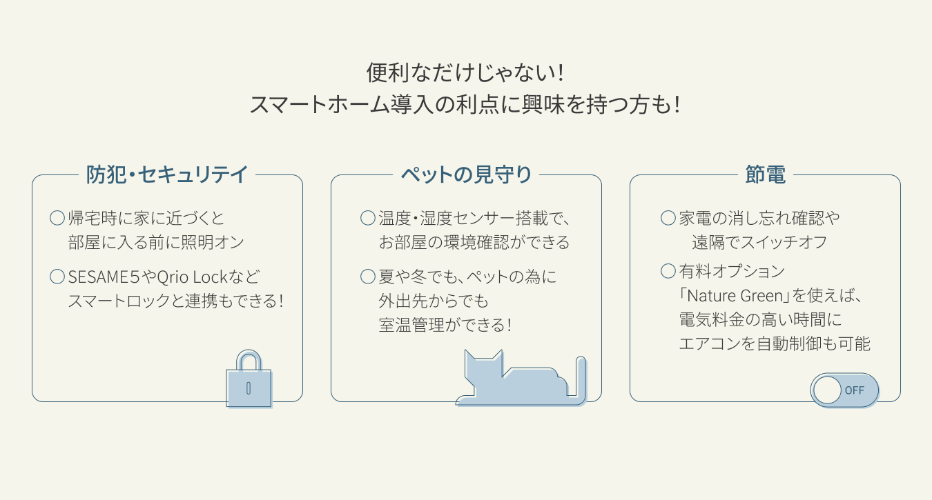 まだ少数派ではあるが、防犯・セキュリティやペットの見守り(室温管理)、節電の観点からスマートホーム化に興味を抱く方がいることがわかった。