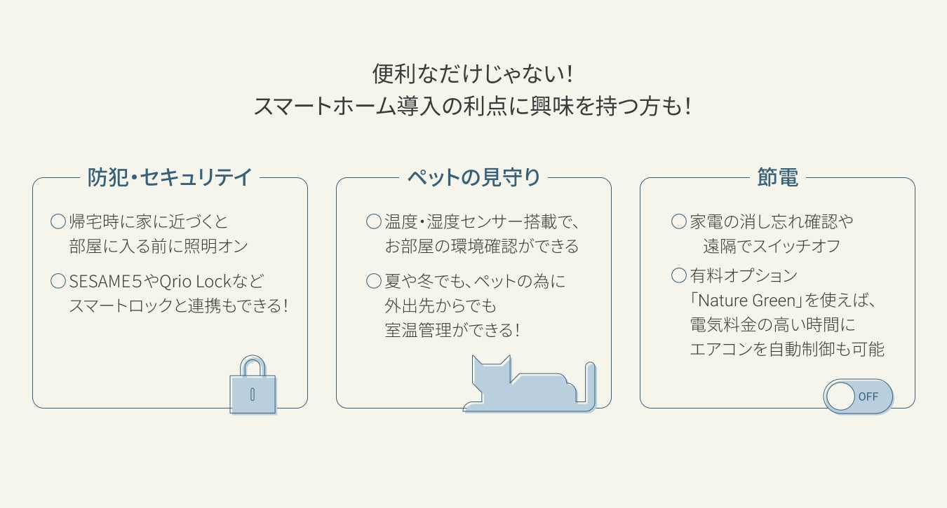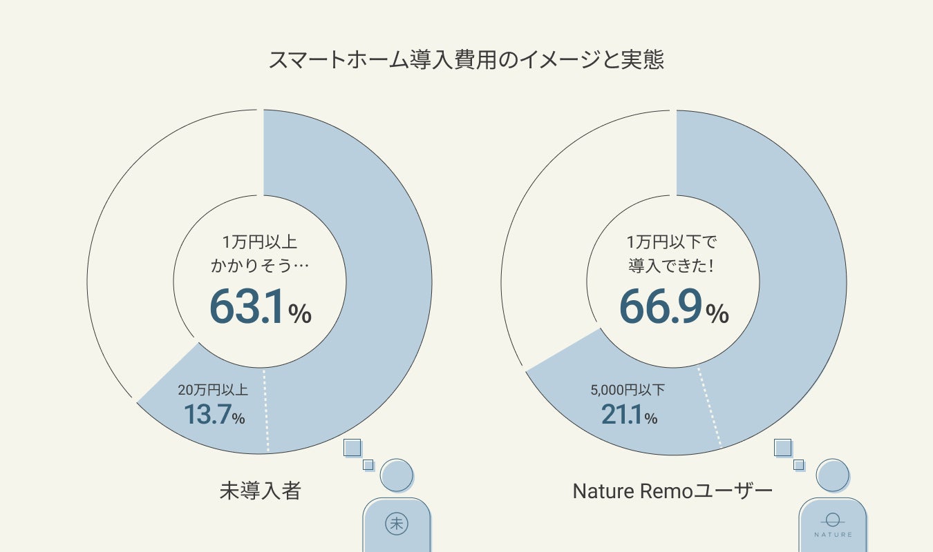 - スマートホーム導入費用は、未導入者の63.1%が1万円以上かかると思っている。しかし、Nature Remoユーザーの66.9%が1万円以下でスマートホームを導入したと判明!温度、湿度、人感センサー等を搭載した「Nature Remo 3」は9,980円、「Nature Remo mini 2」(5,480円)や「Nature Remo nano」(3,980円)は、他のスマートホーム製品と合わせても1万円以内でお買い求めいただけます。