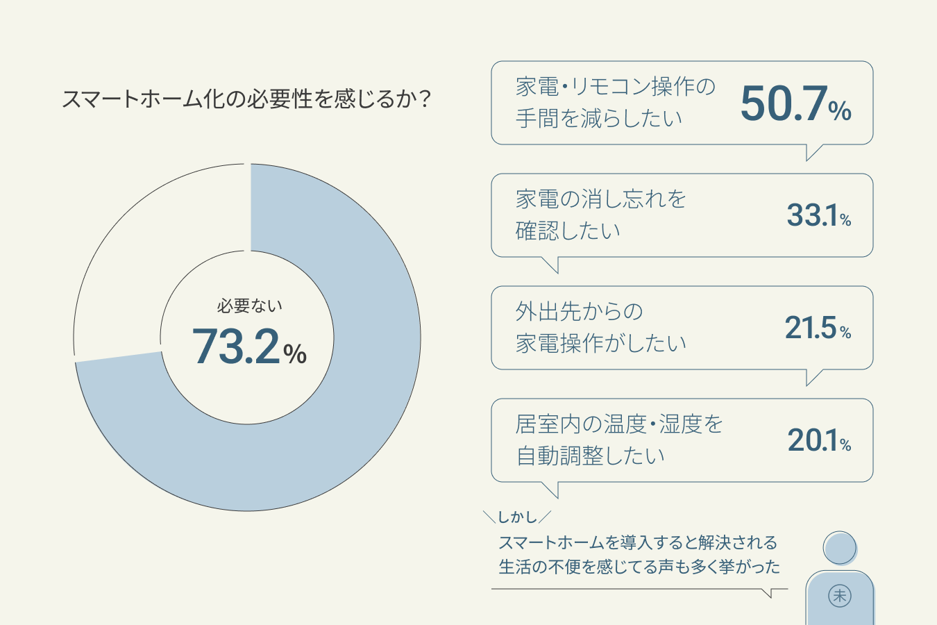未導入者に「スマートホーム化の必要性を感じるか?」という質問に対し、73.2%が必要なさそうと回答。一方で”家電・リモコン操作の手間を減らしたい”方は、50.7%と半数以上いた。他にも”家電の消し忘れを確認したい”や”外出先からの家電(エアコンや湯張り)操作がしたい”、”部屋の温度や湿度を自動で快適に保ちたい”といったスマートホーム導入で解消できる日常生活における不便さを感じている事がわかった。