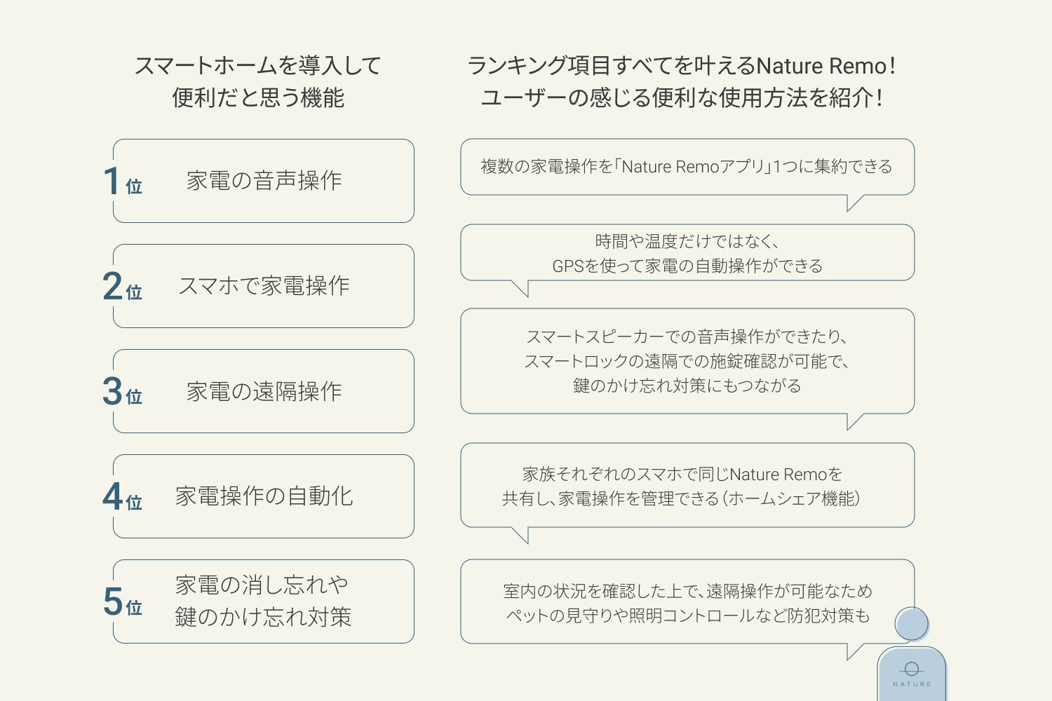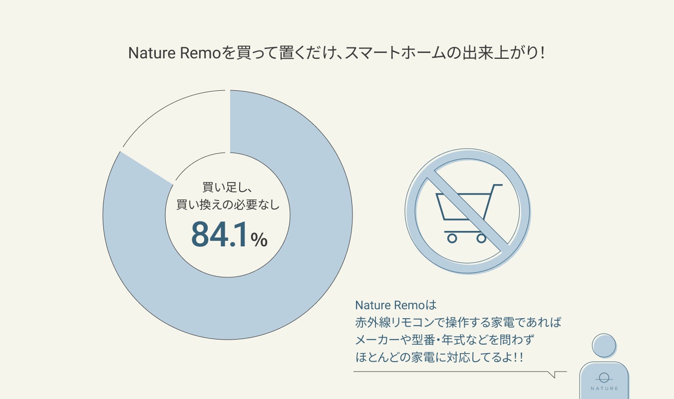 - Nature Remoユーザーは、スマートホーム導入に際し、84.1%の方が新しい家電の購入または家電の買い替えの必要はなかったと回答。スマートホームは、Nature Remoやスマートリモコンを買うだけでも、ミニマムスタートが可能。