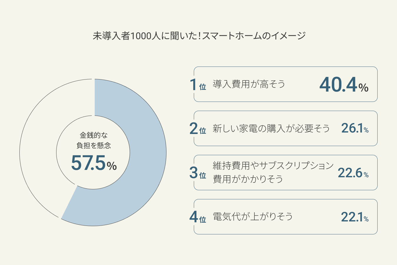 未導入者のスマートホームに対するイメージは、”導入費用が高そう”、”電気代が上がりそう”、”新しい家電を購入する必要がありそう”や”維持費用がかかりそう”といった金銭的な負担を懸念する方が、57.5%と多い。”何が便利になるのかがわからない”といった導入後のイメージが湧かない方も18.2%いる。