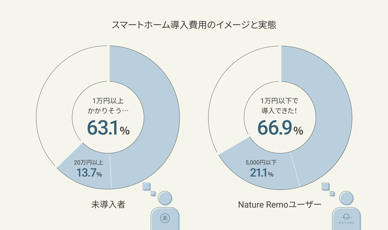 スマートホーム導入費用は、未導入者の63.1%が1万円以上かかると思っている。しかし、Nature Remoユーザーの66.9%が1万円以下でスマートホームを導入したと判明!温度、湿度、人感センサー等を搭載した「Nature Remo 3」は9,980円、「Nature Remo mini 2」(5,480円)や「Nature Remo nano」(3,980円)は、他のスマートホーム製品と合わせても1万円以内でお買い求めいただけます。