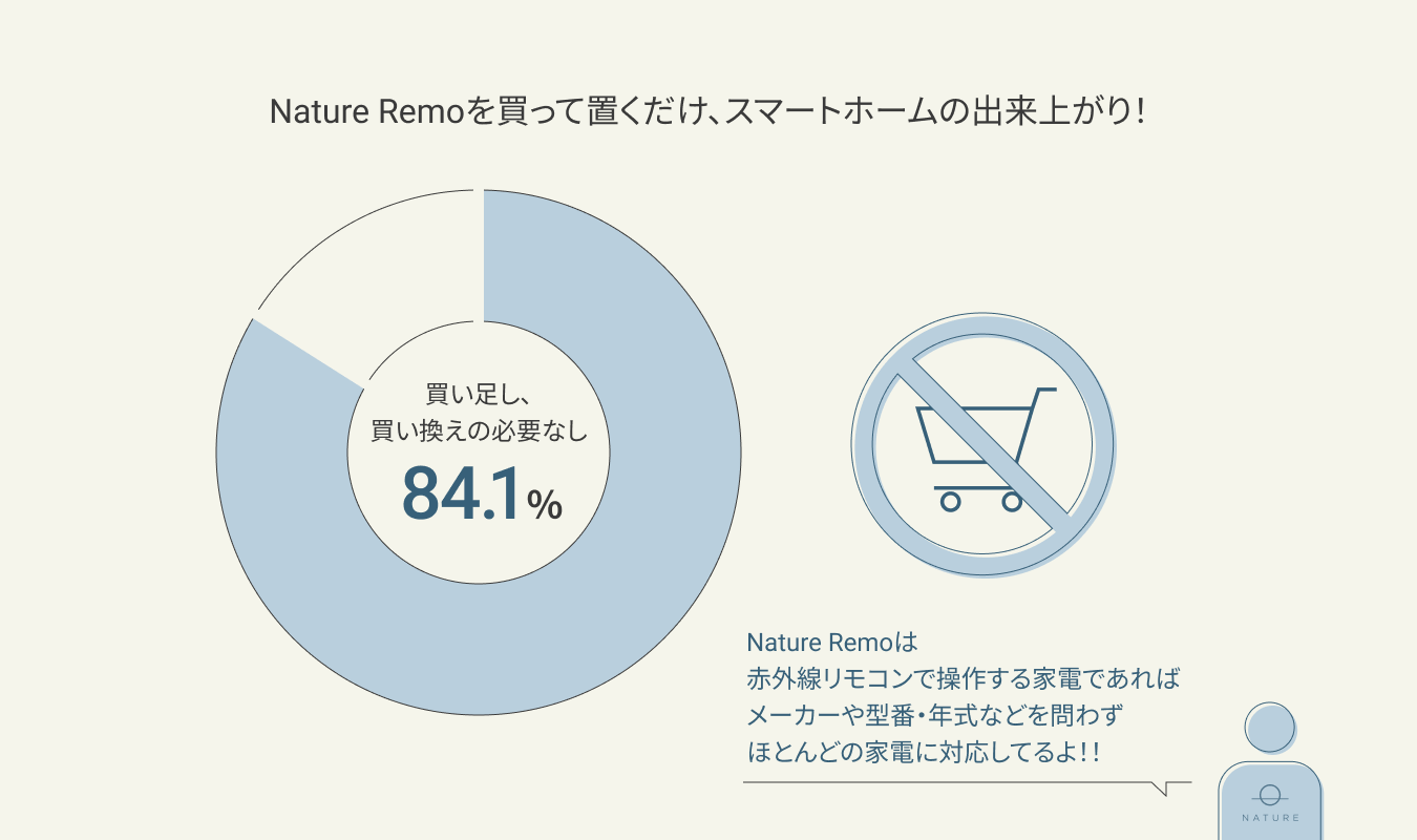 Nature Remoユーザーは、スマートホーム導入に際し、84.1%の方が新しい家電の購入または家電の買い替えの必要はなかったと回答。スマートホームは、Nature Remoやスマートリモコンを買うだけでも、ミニマムスタートが可能。