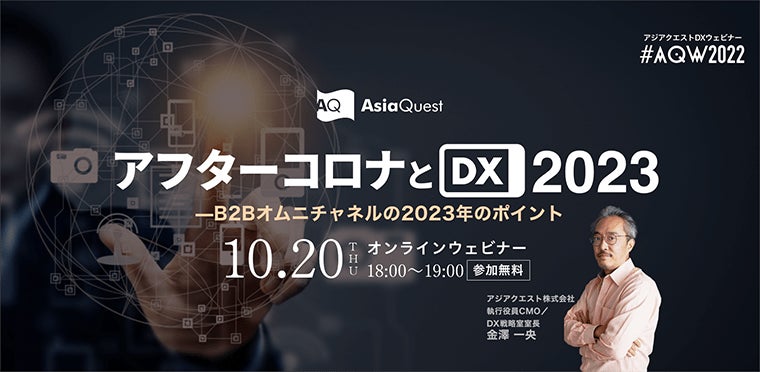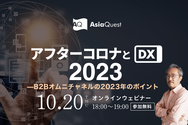 IoT、AIなどのデジタル技術を活用して企業のデジタルトランスフォーメーション(以下、DX)を支援するアジアクエスト株式会社(本社所在地: 東京都千代田区飯田橋 代表取締役: 桃井純 以下、アジアクエスト)は10/20(木)にウェビナー『アフターコロナとDX2023 — B2Bオムニチャネルの2023年のポイント』を開催します。