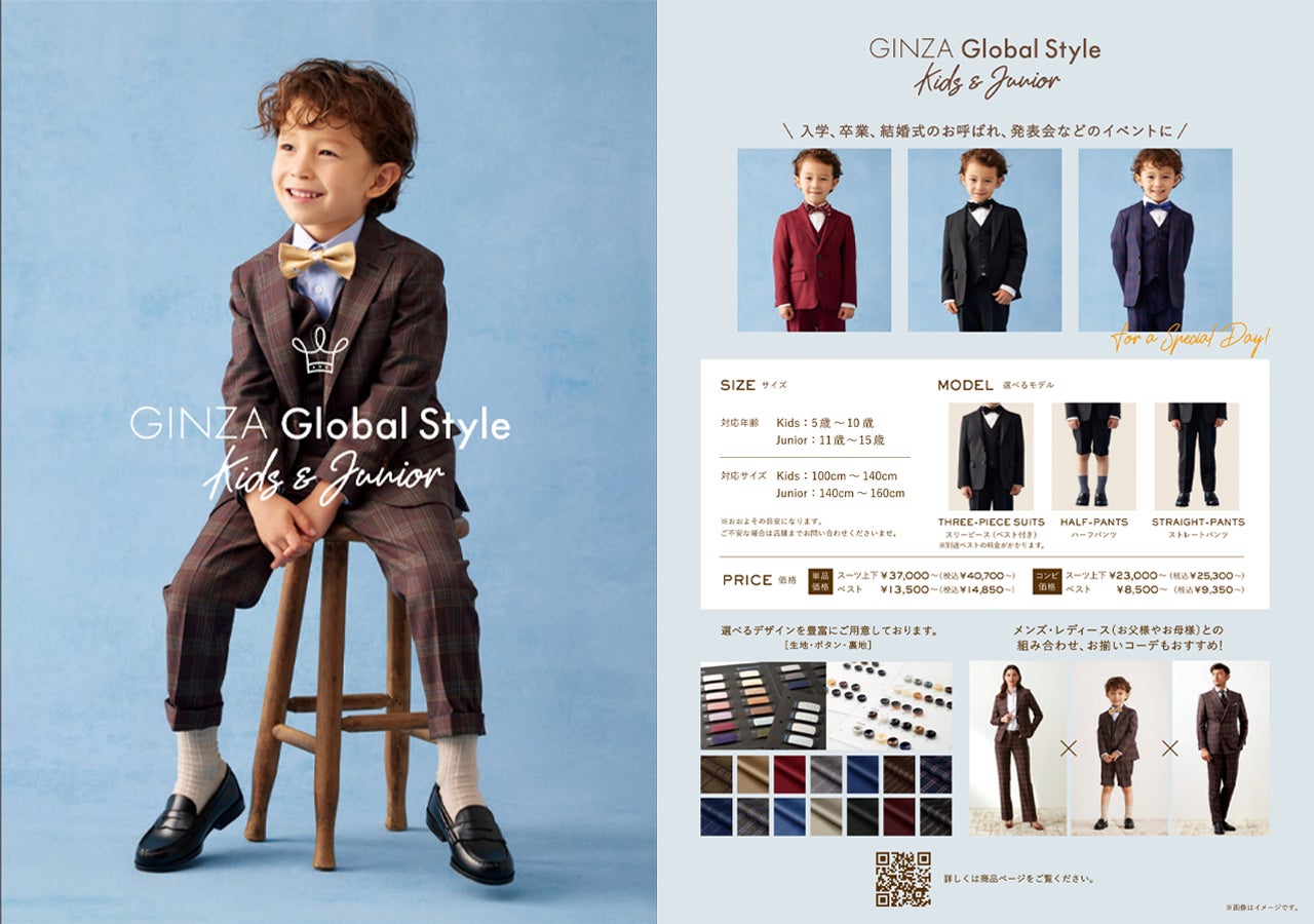 オーダースーツ専門店「GINZAグローバルスタイル」がご要望の多い「フォーマルオーダースーツ」「キッズ&ジュニア」「ギフト券」のフライヤーをついに店頭にて配布開始!