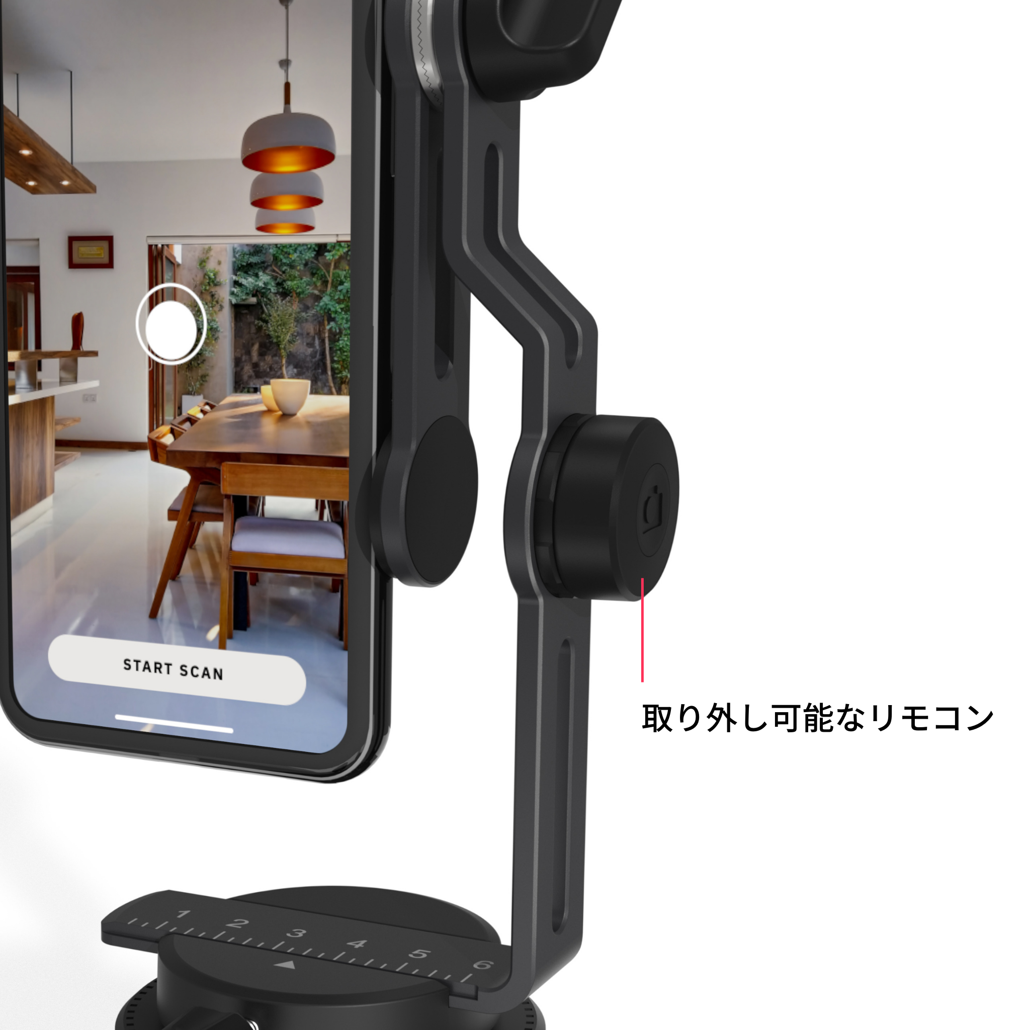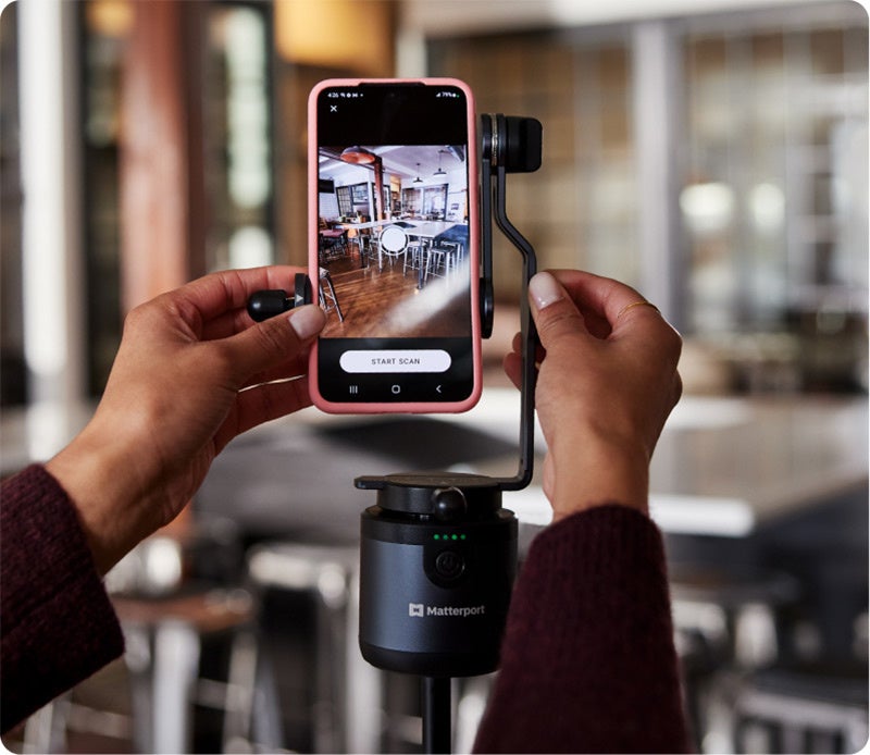 Matterport Axisは、モーター駆動式の自動回転雲台です。Matterport Axisは、360°自動的に回転するのでその課題を解決し、スマートフォンを装着することで一貫性を保った360°撮影が可能となり、実空間を忠実に再現したデジタルツインデータを作り出します。