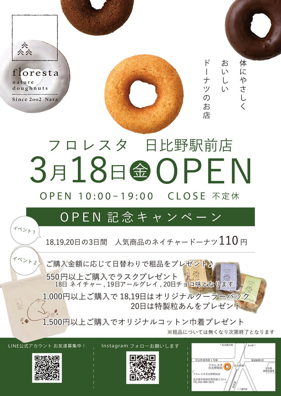 体にやさしい自然派ドーナツのお店 フロレスタ「日比野駅前店」3月18日(金)グランドオープン。OPEN記念キャンペーンを開催。