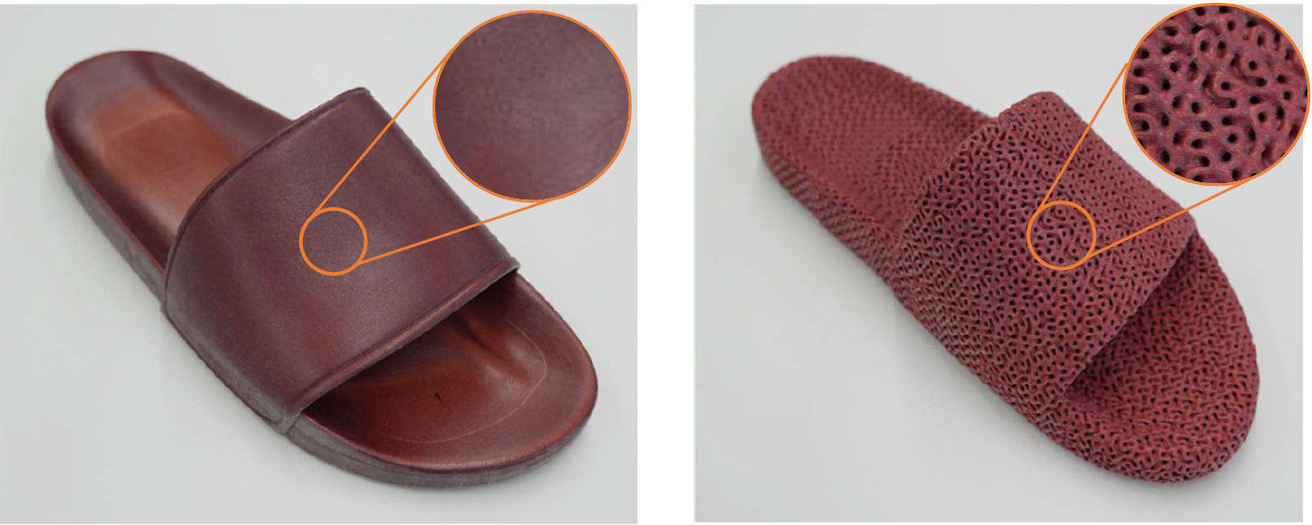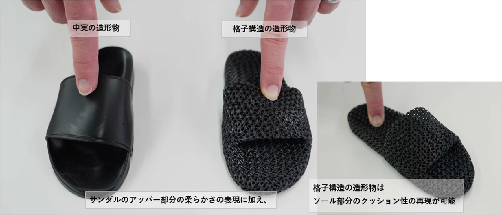 3D造形物の内部構造として、従来の中空(内部が空間)および中実(内部が詰まった構造)に加え、新たに格子構造を選択可能となりました。4種類から選択できる格子パターンと、自由に調整可能な密度設定により、造形物の軽量化(図2)はもちろん、柔軟性のある3Dプリント材料と組み合わせることで、クッション性や布地の柔らかさといった質感の再現(図3)にも対応します。靴やソファ、ベッドなどの模型試作において、多方向からの柔軟性を再現したモックアップを実現します。