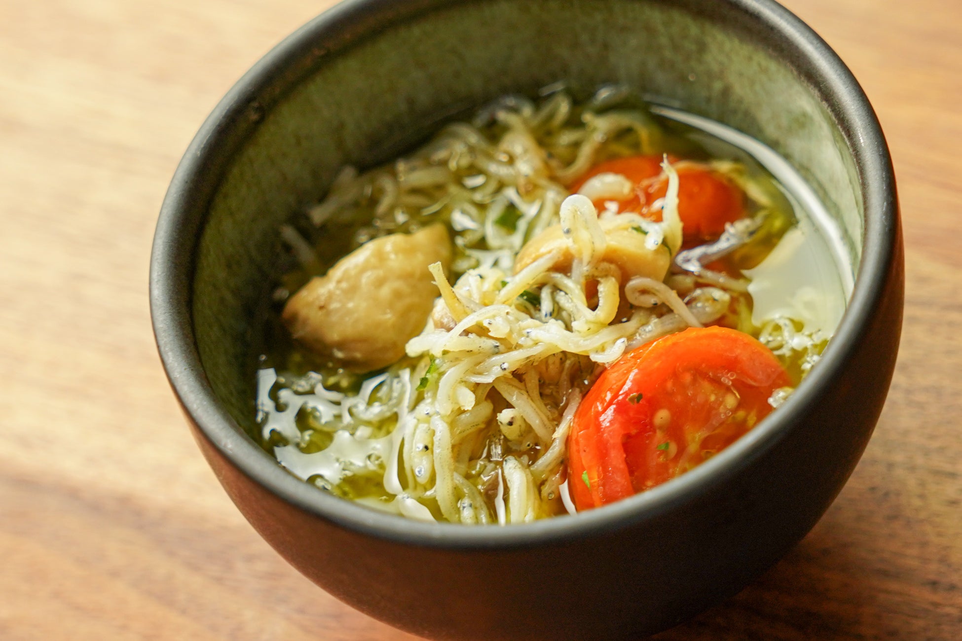 ガーリックとマッシュルームの香り、トマトの酸味と甘さ、しらすの塩味が絶妙に効いたアヒージョ。しらすのイノシン酸とマッシュルームのグルタミン酸、うまみ成分の相乗効果を最大限に活かした一品です。