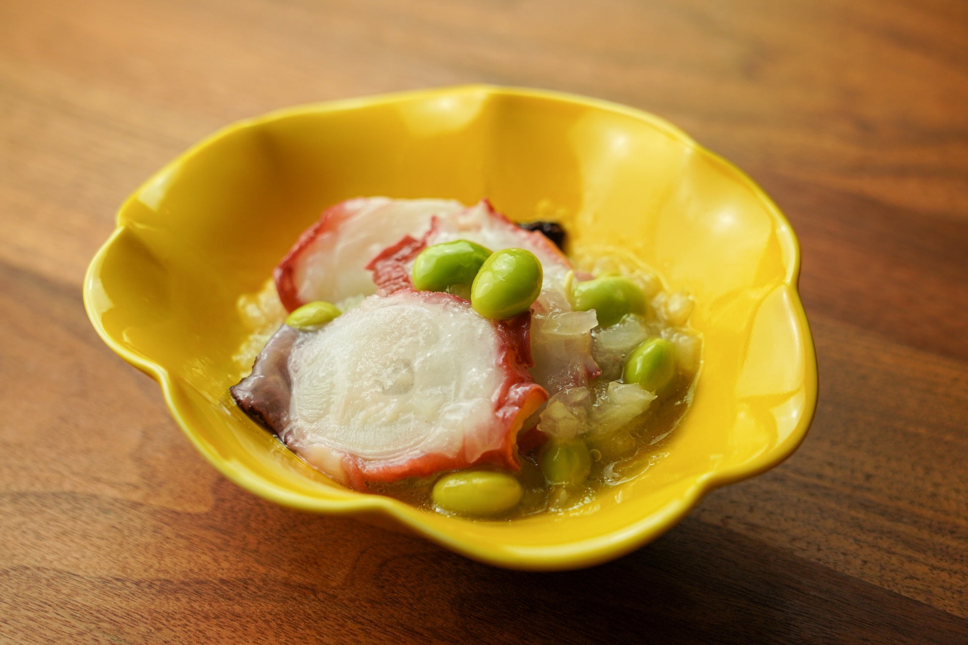 タコと枝豆をレモンの酸味を効かせたさっぱりマリネにしました。タコには肝臓をサポートしてくれるダウリン、枝豆にはアルコールと分解してくれるビタミンB群が豊富で、まさにお酒と一緒に取り入れていただきたい一品です。
