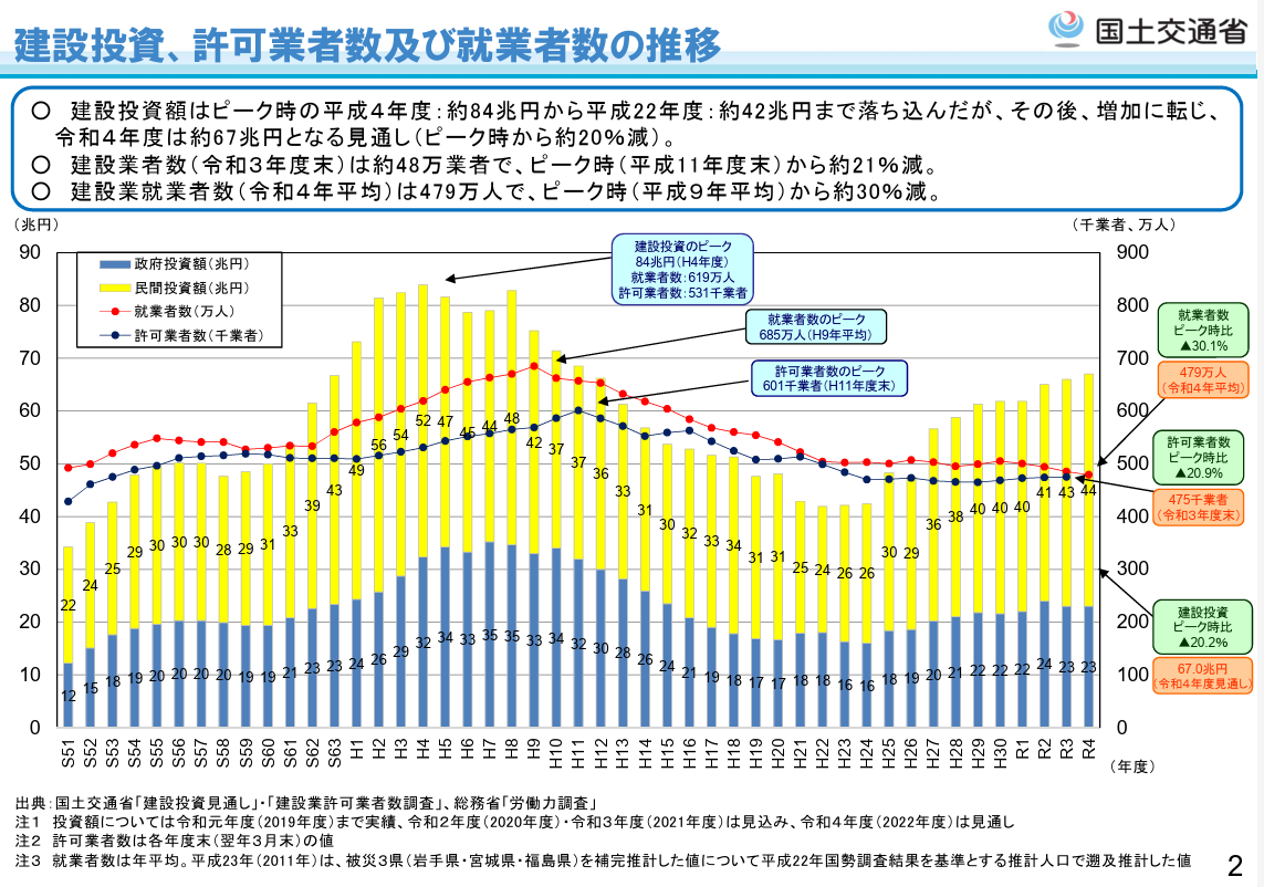 その一方で市場のニーズは拡大しています。国土交通省によると、政府と民間を合わせた建設投資額は2010年度に約42兆円で底を打った後で増加傾向に転じ、2025年度は前年度比3.2%増の約76兆円になる見通しです。