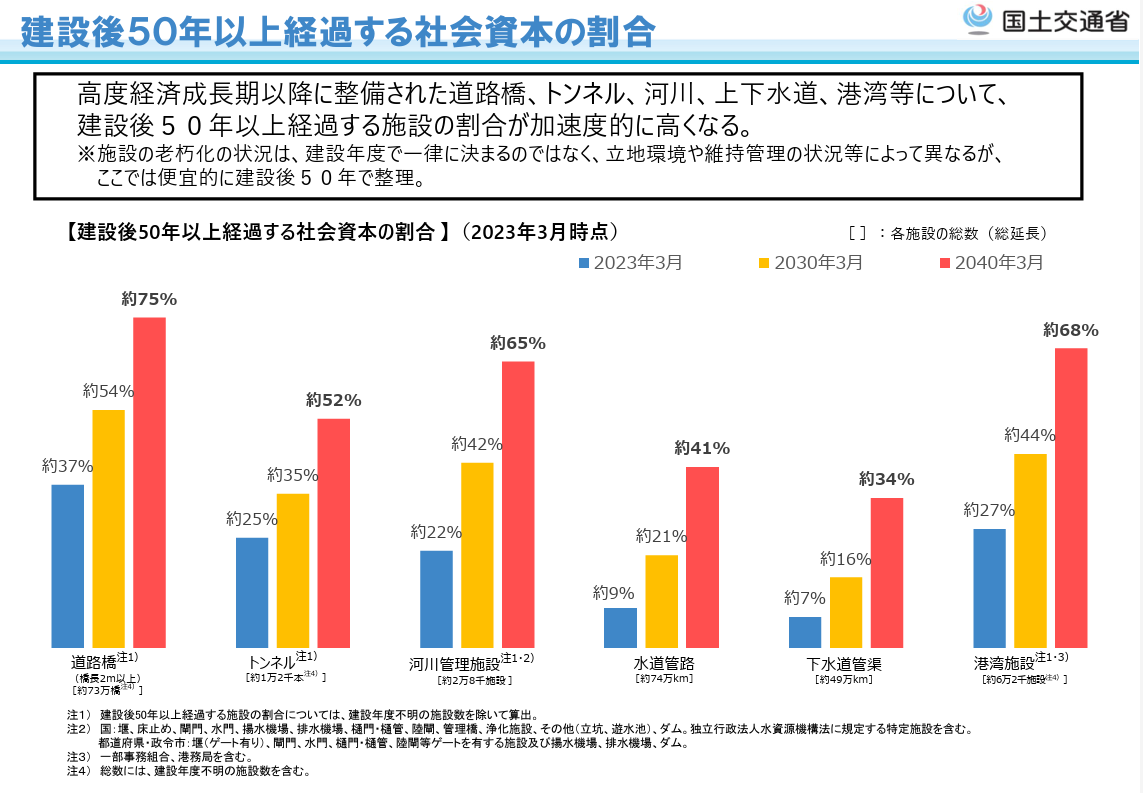 「需要は増えるのに、担い手が減る」という大きな需給ギャップが生じている中、日本が抱えるのが道路橋やトンネル、水道管など社会インフラの老朽化問題です。インフラの多くが高度経済成長期に整備されたため、維持管理やメンテナンスのニーズが今後数十年にわたって加速度的に増大するとみられ、国の最重要課題の一つとなっています。