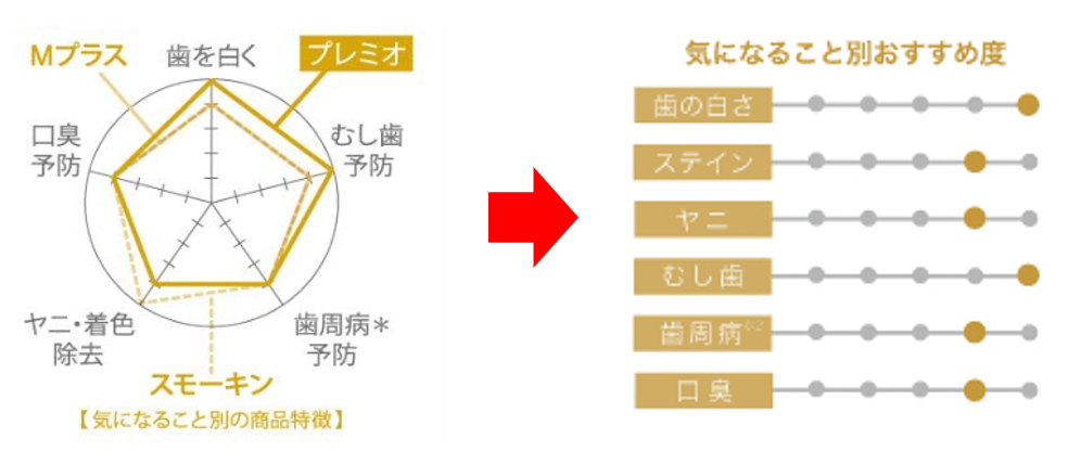 様々な歯の美白ケアニーズに応えるため、気になることをタイプ別にわかりやすく、選びやすいようチャートなどをリニューアルいたしました。さらに、ブランドロゴをカタカナ表記から英語表記へ世界共通に統一。
