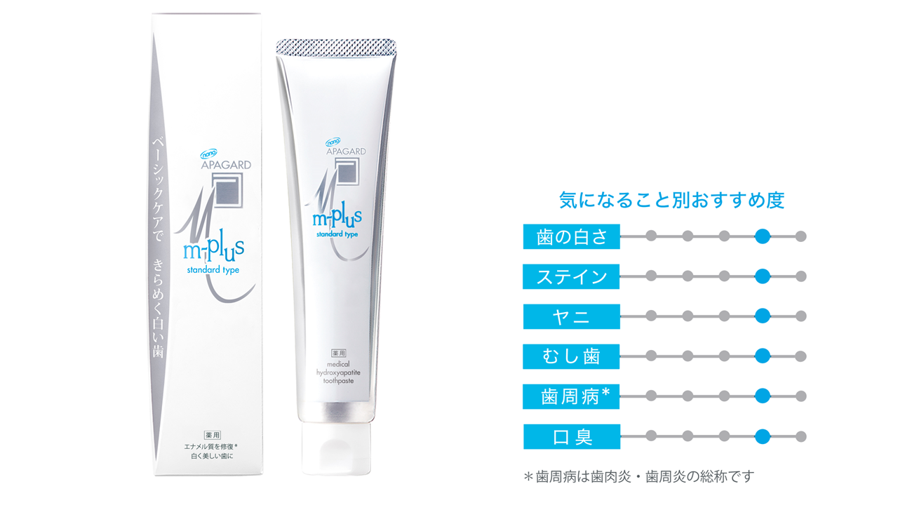 アパガードだけでなく、サンギの自社商品とOEM商品のみに配合されている成分です。この「薬用ハイドロキシアパタイト」は、基剤や研磨剤として配合されている一般のハイドロキシアパタイトとは異なり、歯のエナメル質へ直接働きかけ、3つの作用でむし歯を予防します。