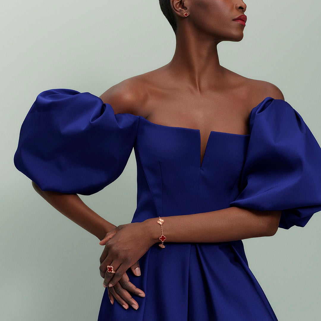 アルハンブラはその誕生以来、ヴァン クリーフ&アーペルを象徴するコレクションとして、際立った存在感を放ってきました。特別な瞬間や素材に光を当てるために、数多くの優美なバリエーションが展開されています。新作となるヴィンテージ アルハンブラのブレスレットとロングネックレス、スウィート アルハンブラのウォッチのいずれにおいても、やわらかな光を放つローズゴールドと温かな色調を帯びたカーネリアンのモチーフが交互に配され、絶妙なハーモニーを奏でています。メゾンにとって大切な素材であるこのオーナメンタルストーンは、レッドオレンジのニュアンスで作品を華やかに引き立てます。一方、ローズゴールドは、2018年以降のアルハンブラ コレクションの特徴であるギヨシェ彫刻により、やわらかく変化する光の反射を演出します。モチーフに太陽光線のような筋を刻み、貴金属の表面に繊細なレリーフ効果をもたらすことで、まばゆい光の渦が巻き起こり、視線を引き寄せます。